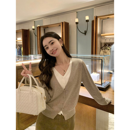 V领拼色假两件针织毛衣开衫外套