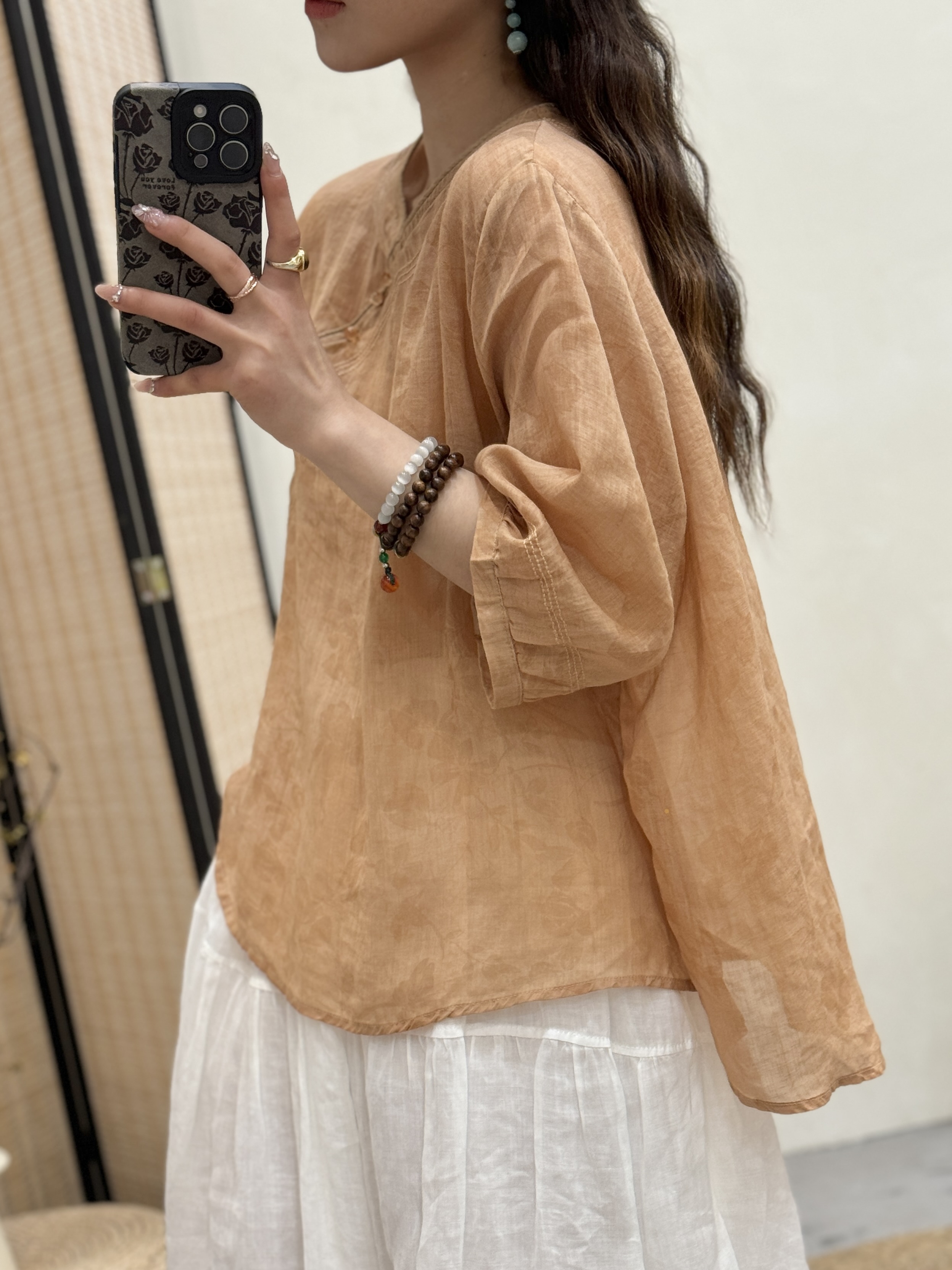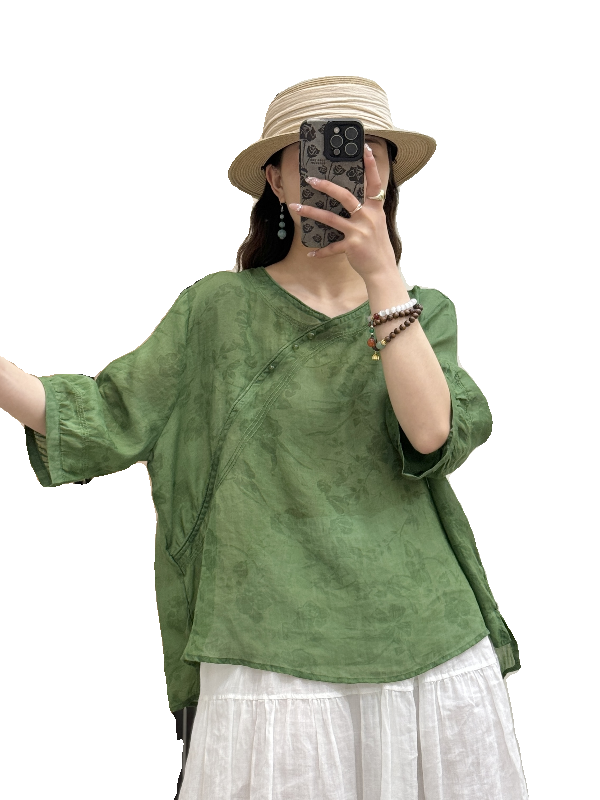 夏季新款复古斜襟印花纯苎麻衬衫女文艺休闲宽松显瘦五分袖上衣薄