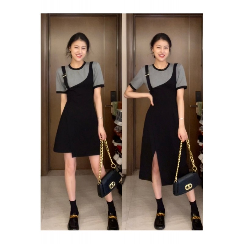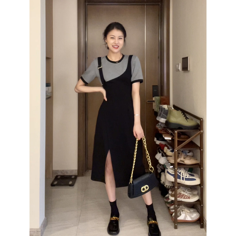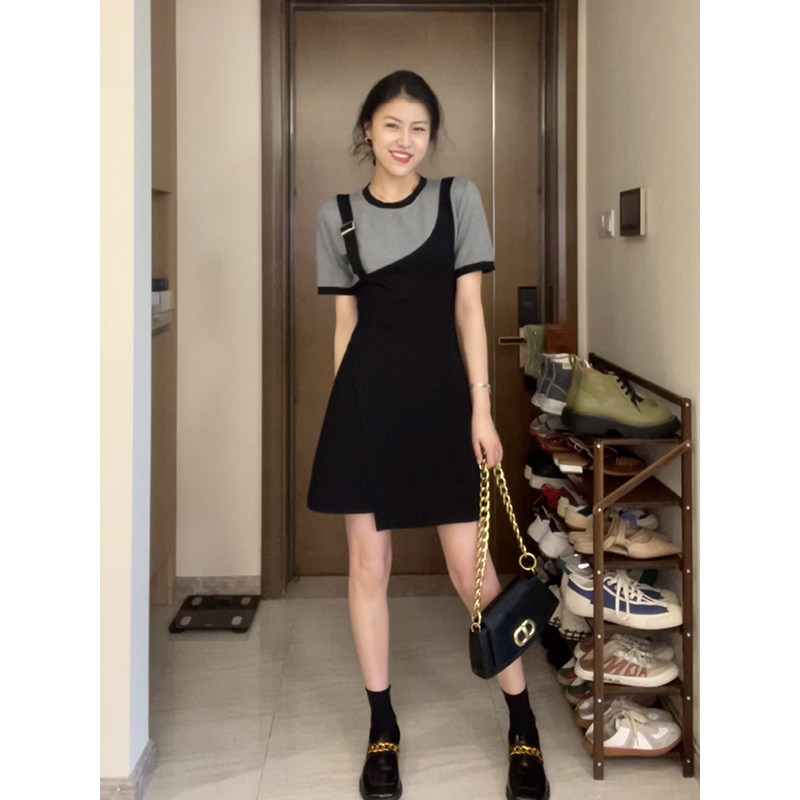 张阿星【弗里丝连衣裙】夏装新款假两件撞色T恤背带裙休闲裙子