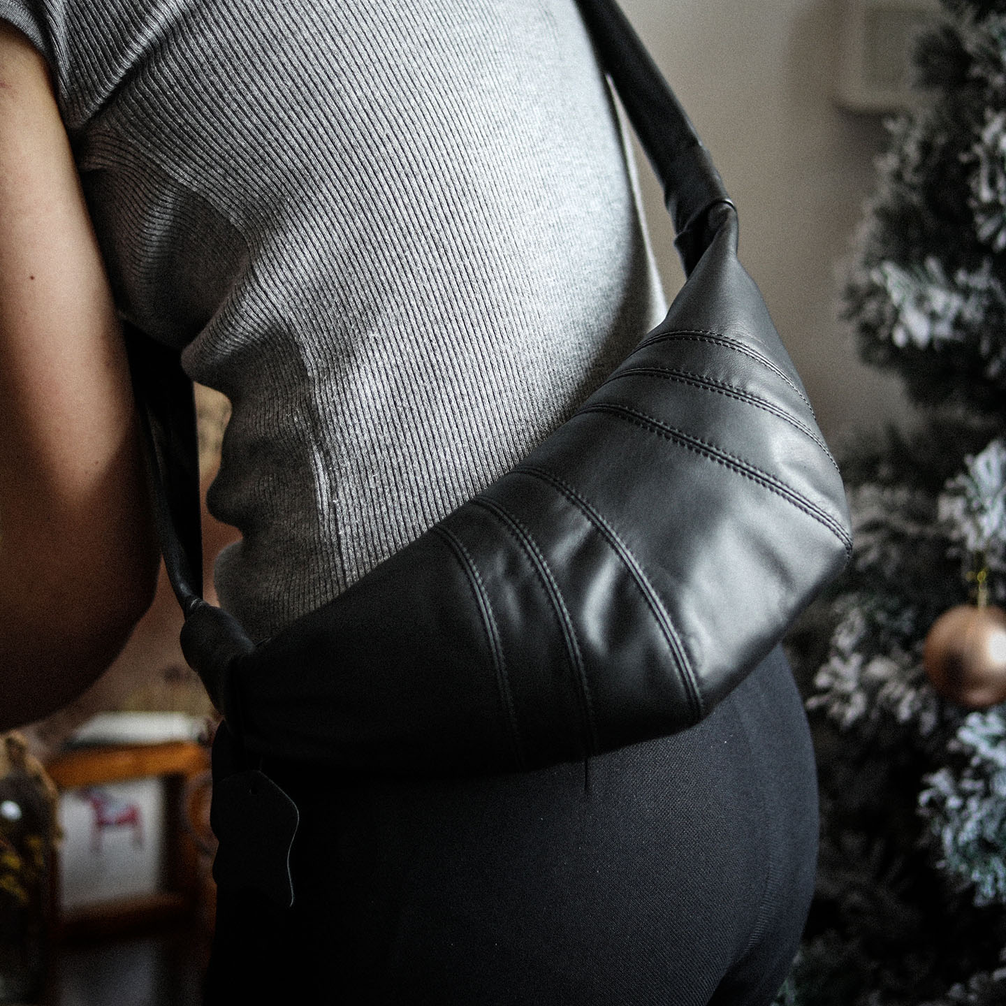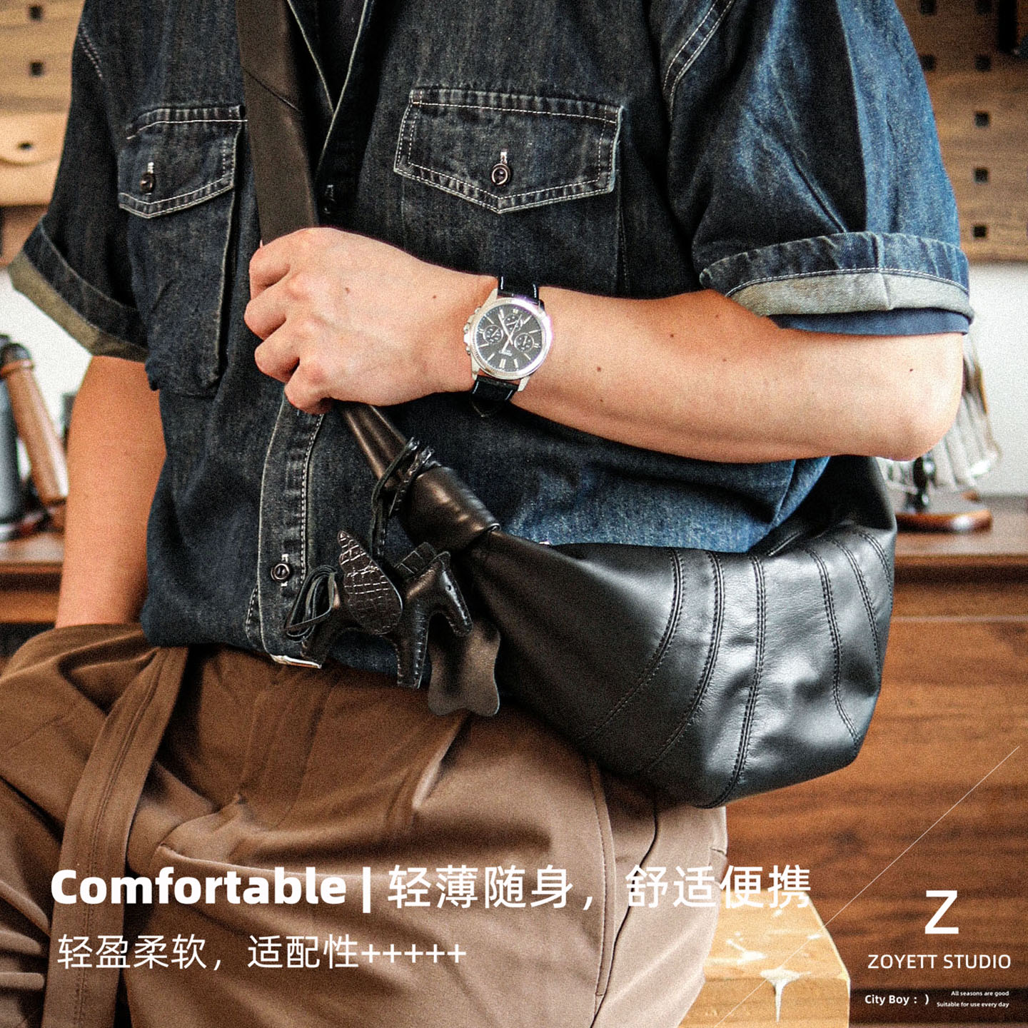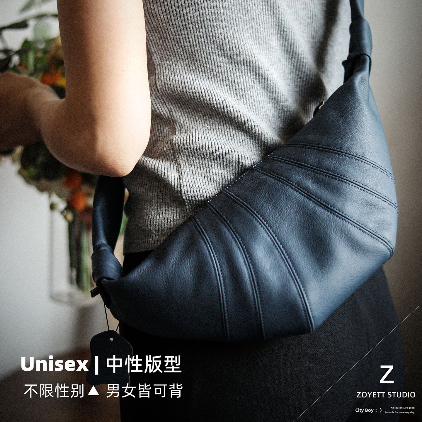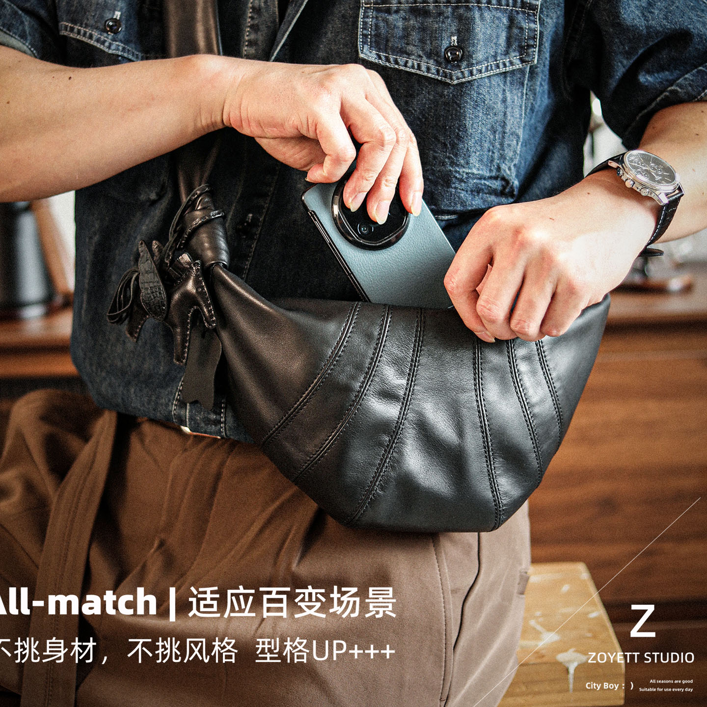原创2025新款牛角包可颂男士单肩斜挎包中性真皮饺子包女牛皮小包