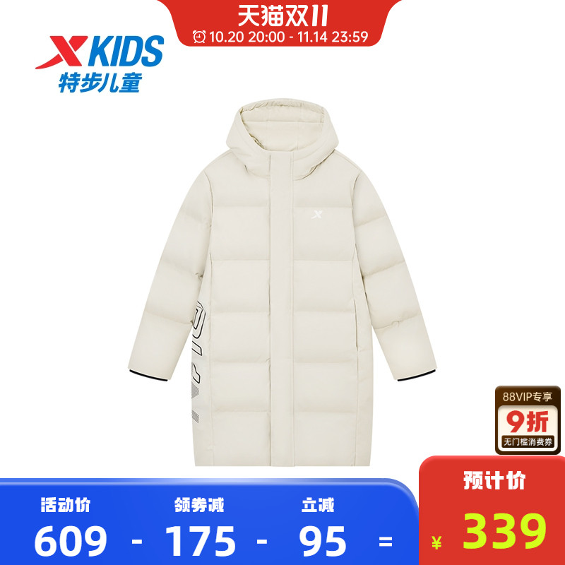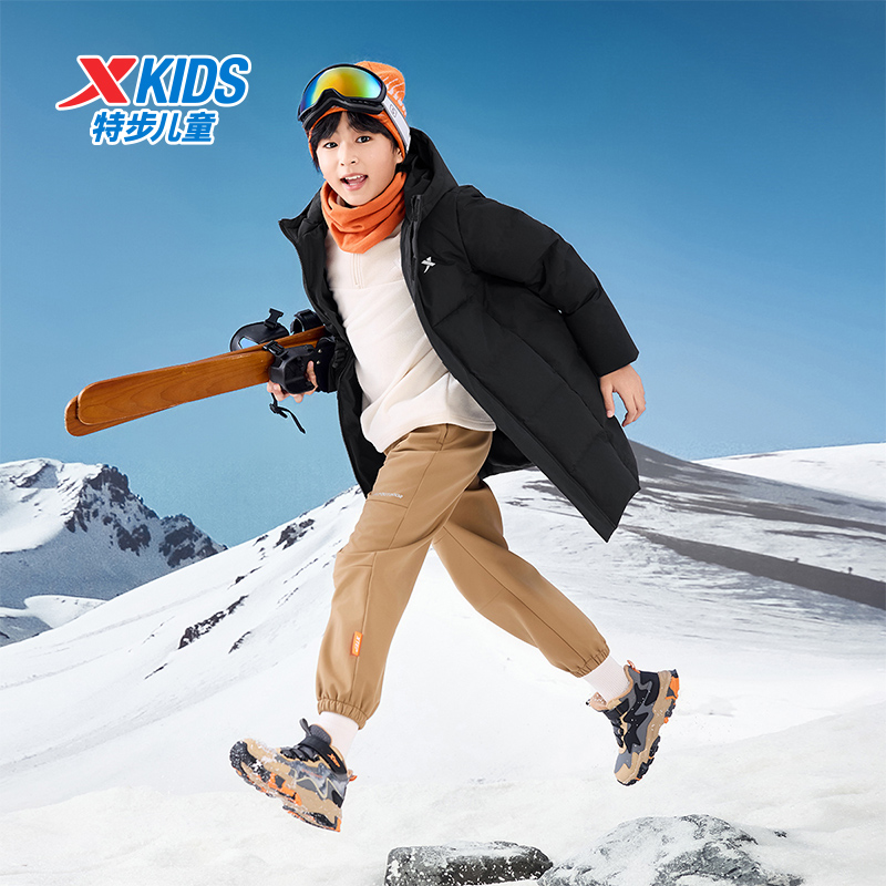 特步童装儿童印花中长款羽绒服2025秋冬款男童防寒服大童外套冬装