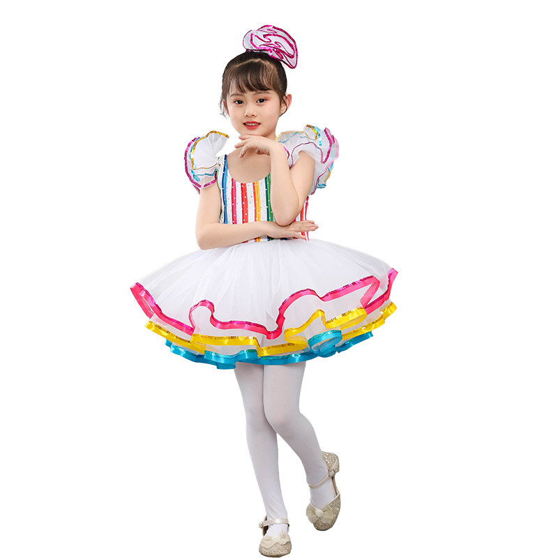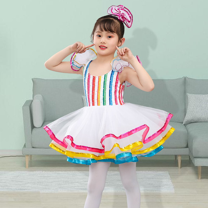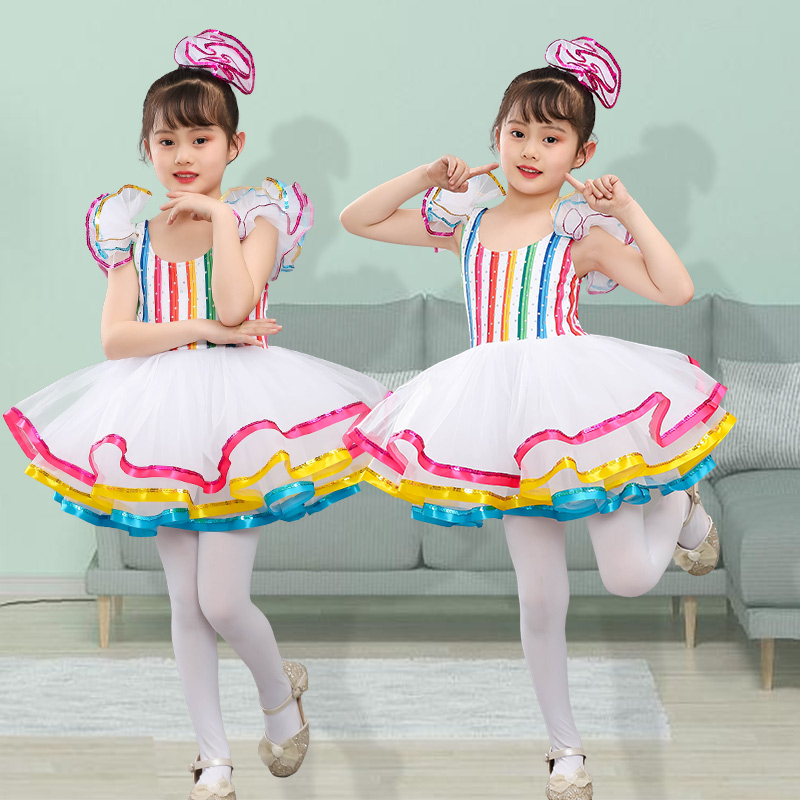 六一儿童七彩蓬蓬裙女童亮片舞蹈A演出服公主纱裙幼儿园可爱表演