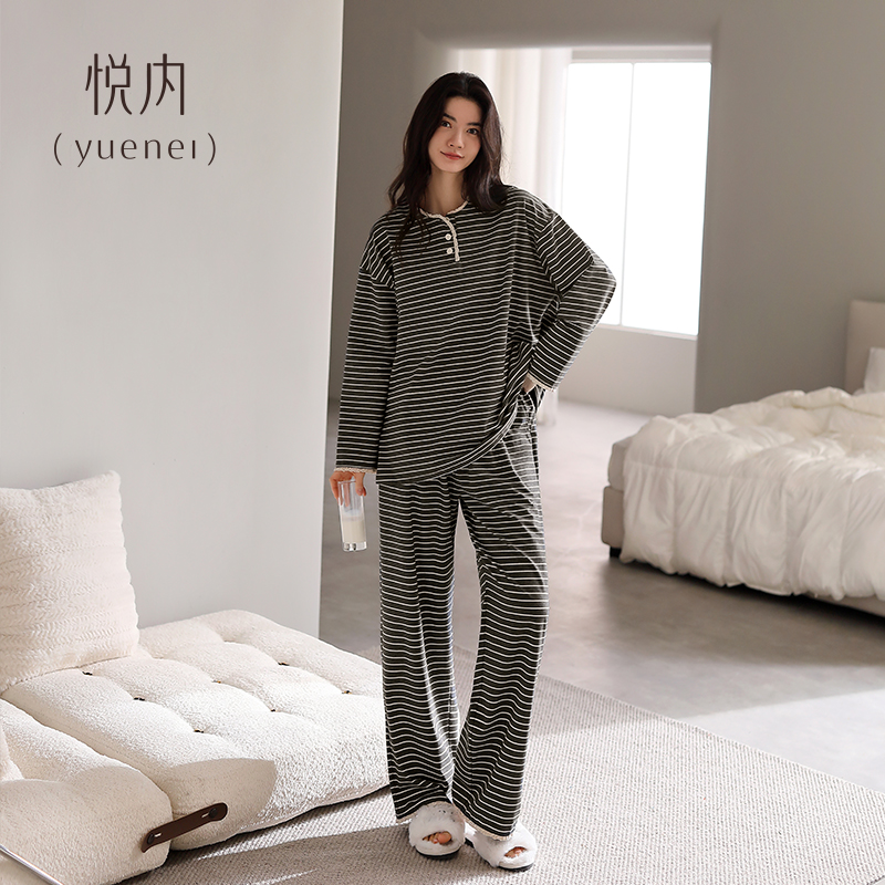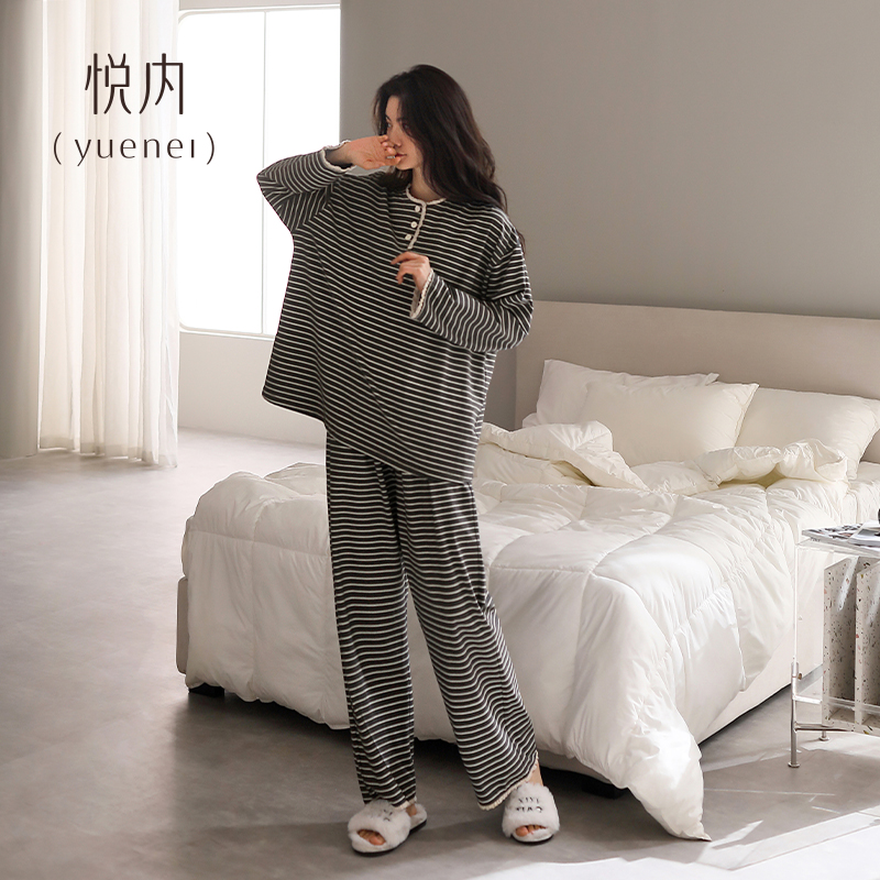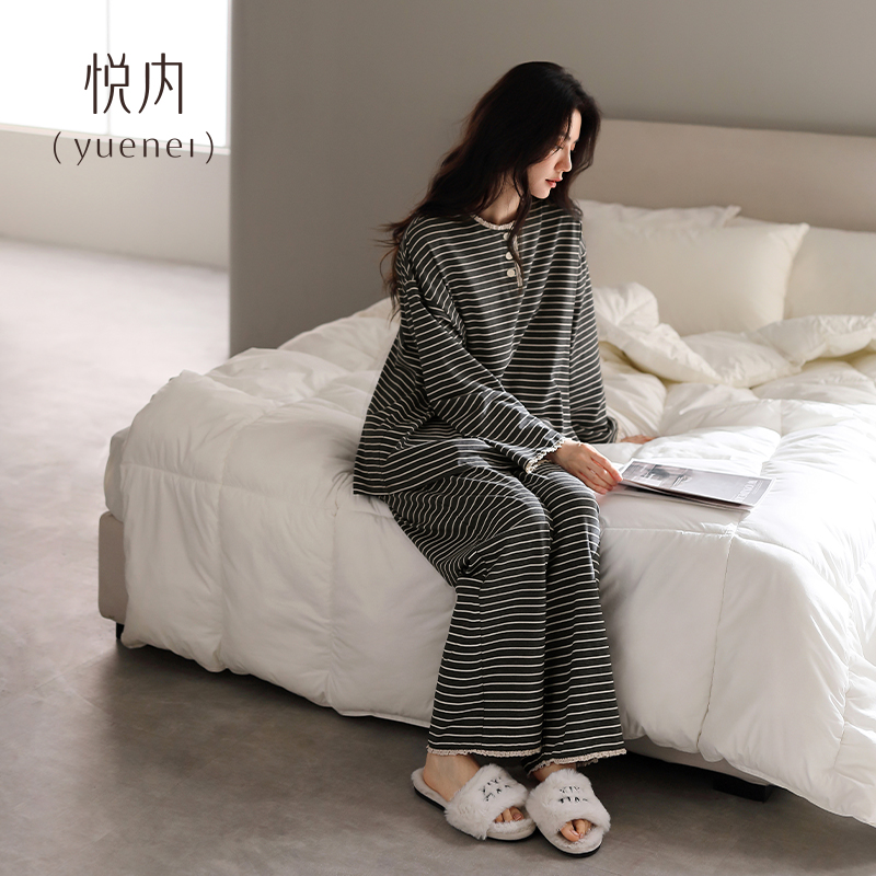 悦内带胸垫一体睡衣女款春秋季秋款长袖纯棉家居服春装条纹可外穿