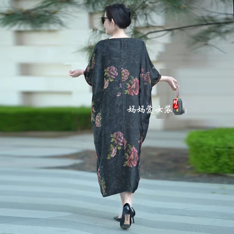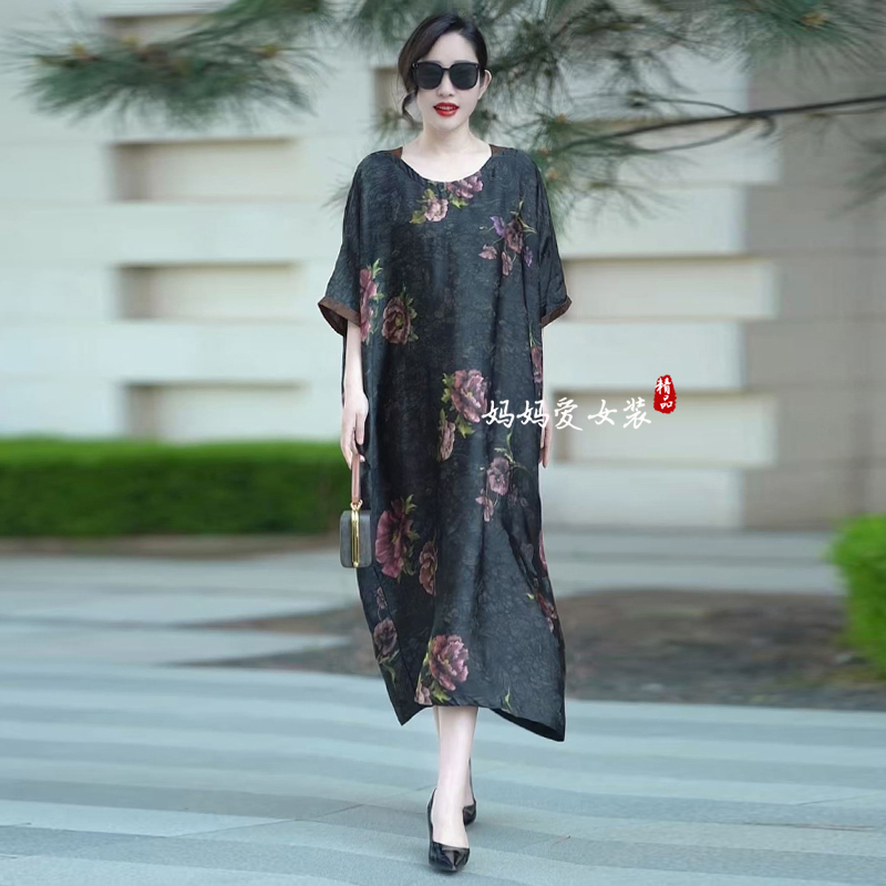 复古印花文艺真丝连衣裙2025夏季落肩款宽松蝙蝠袖显瘦茧型长袍子
