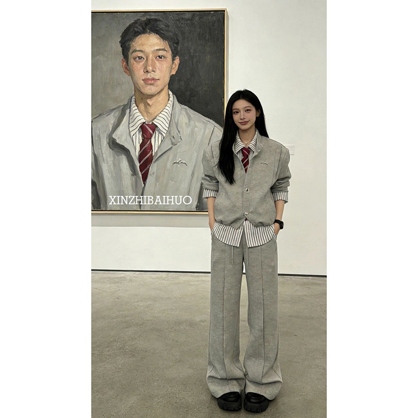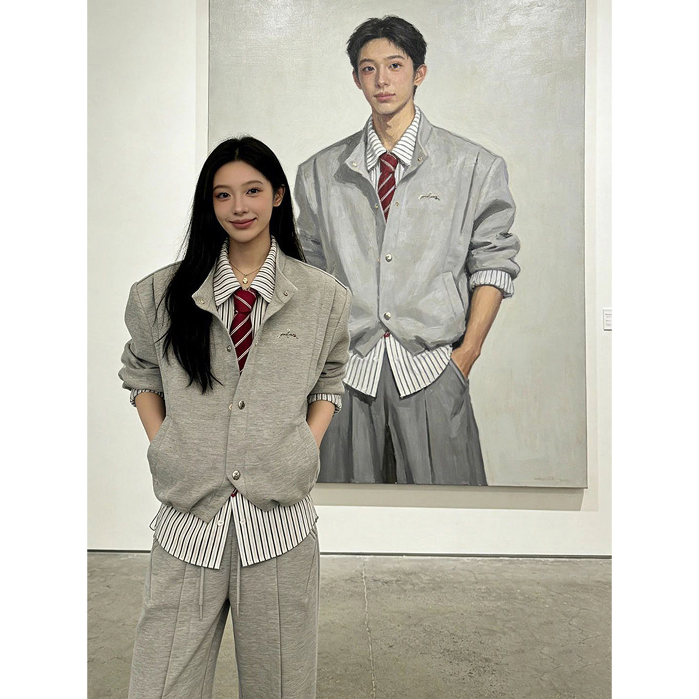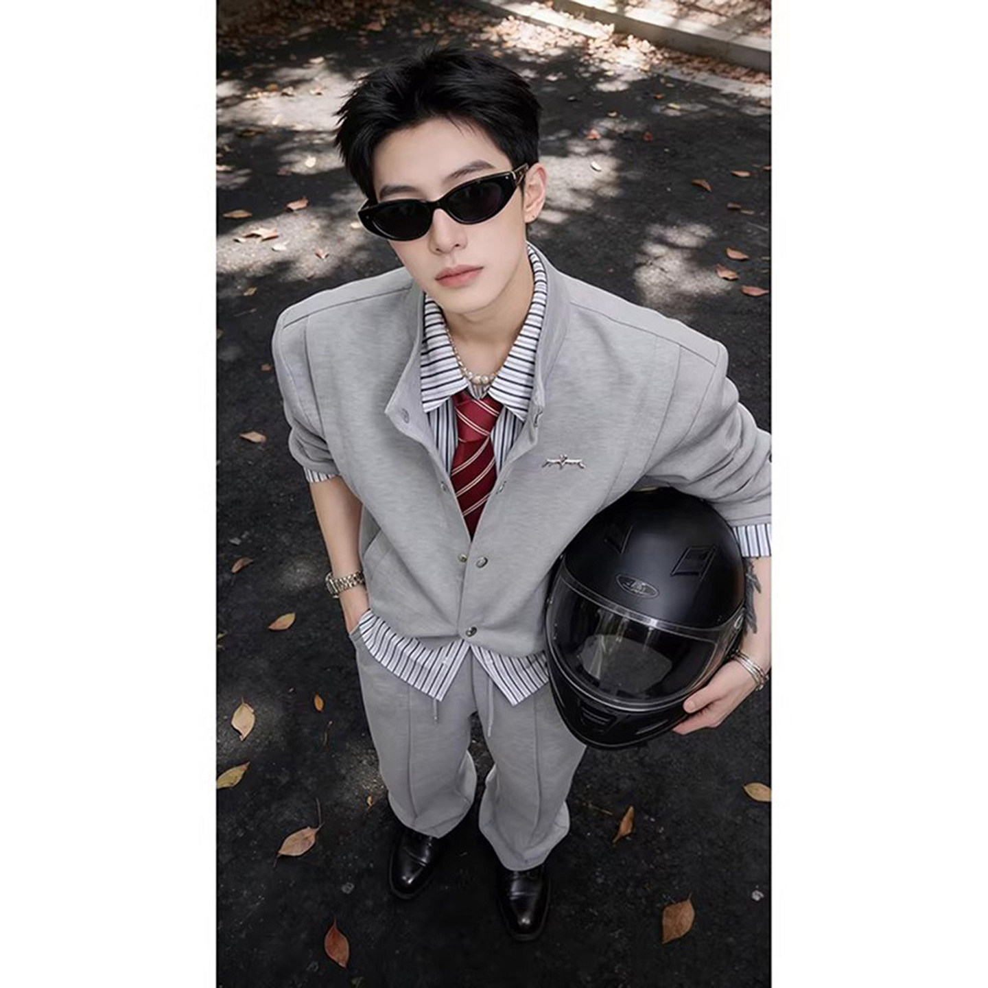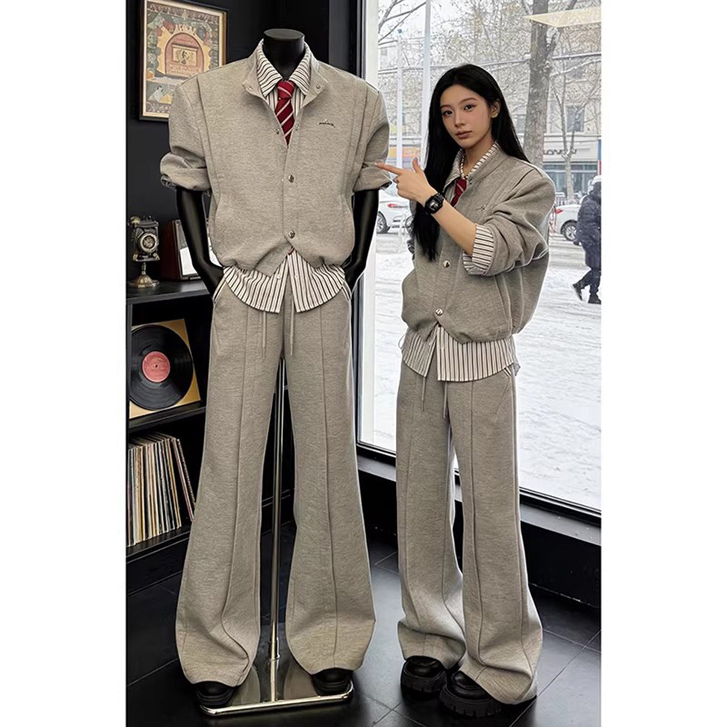韩系假两件拼接格雷系衬衫卫衣卫裤春季装男生痞帅穿搭一整套套装
