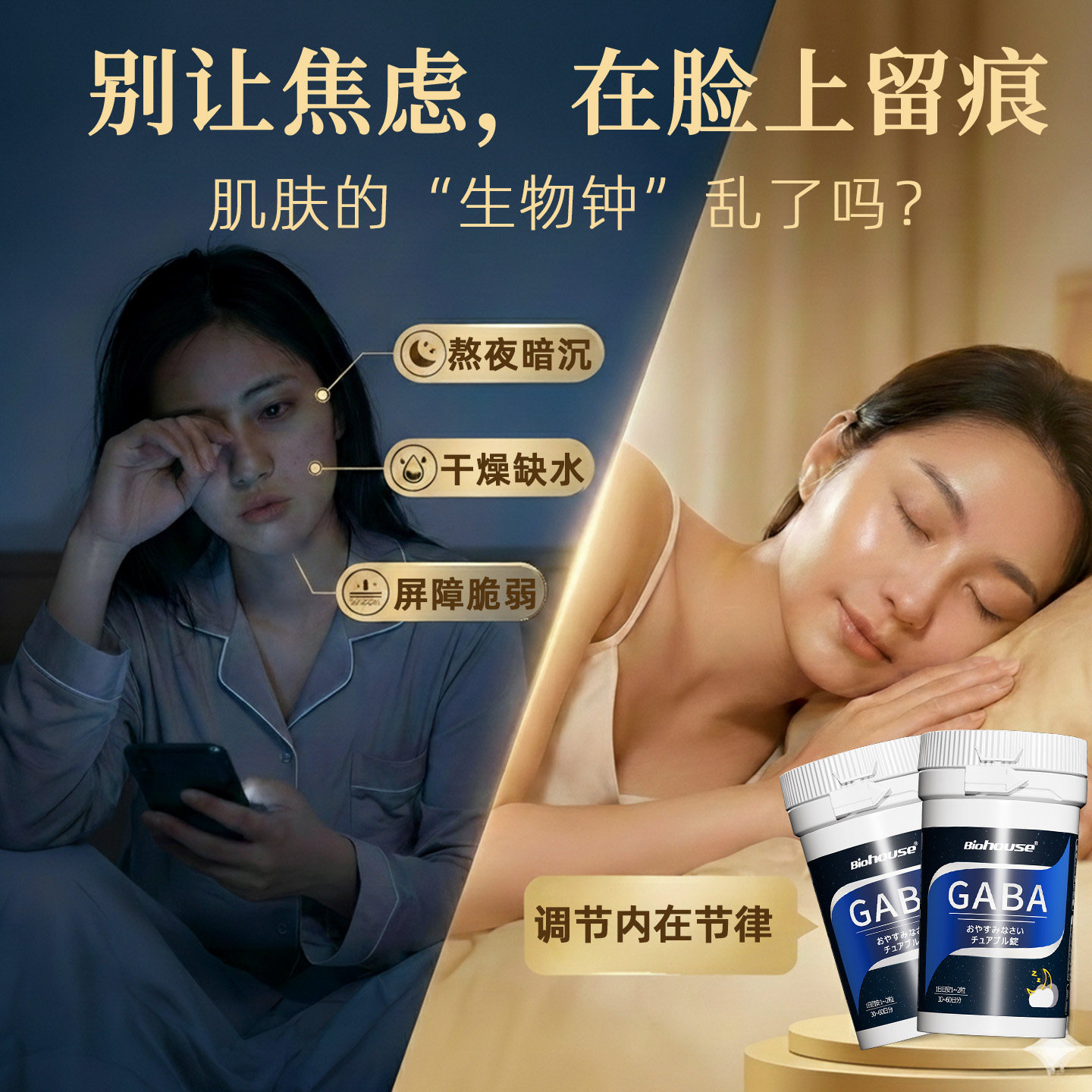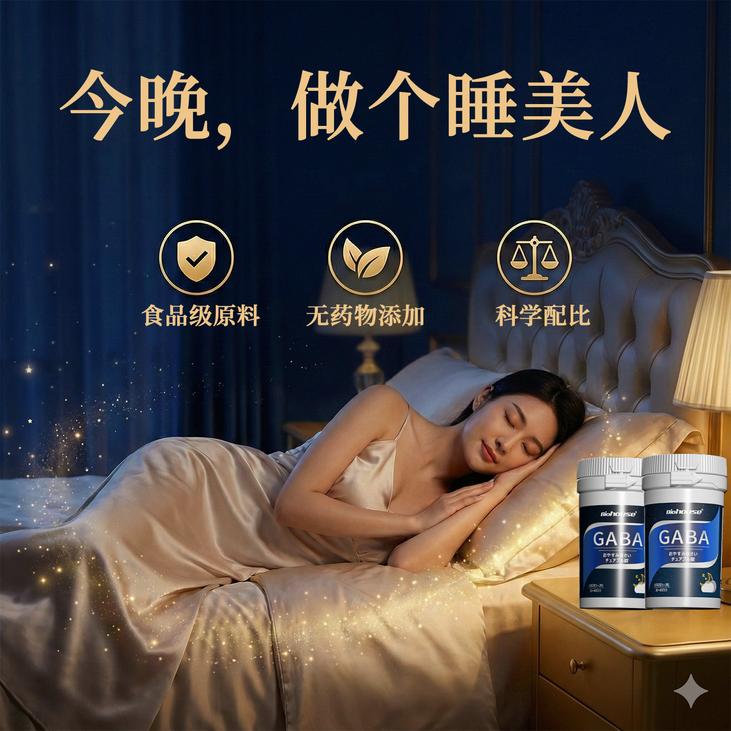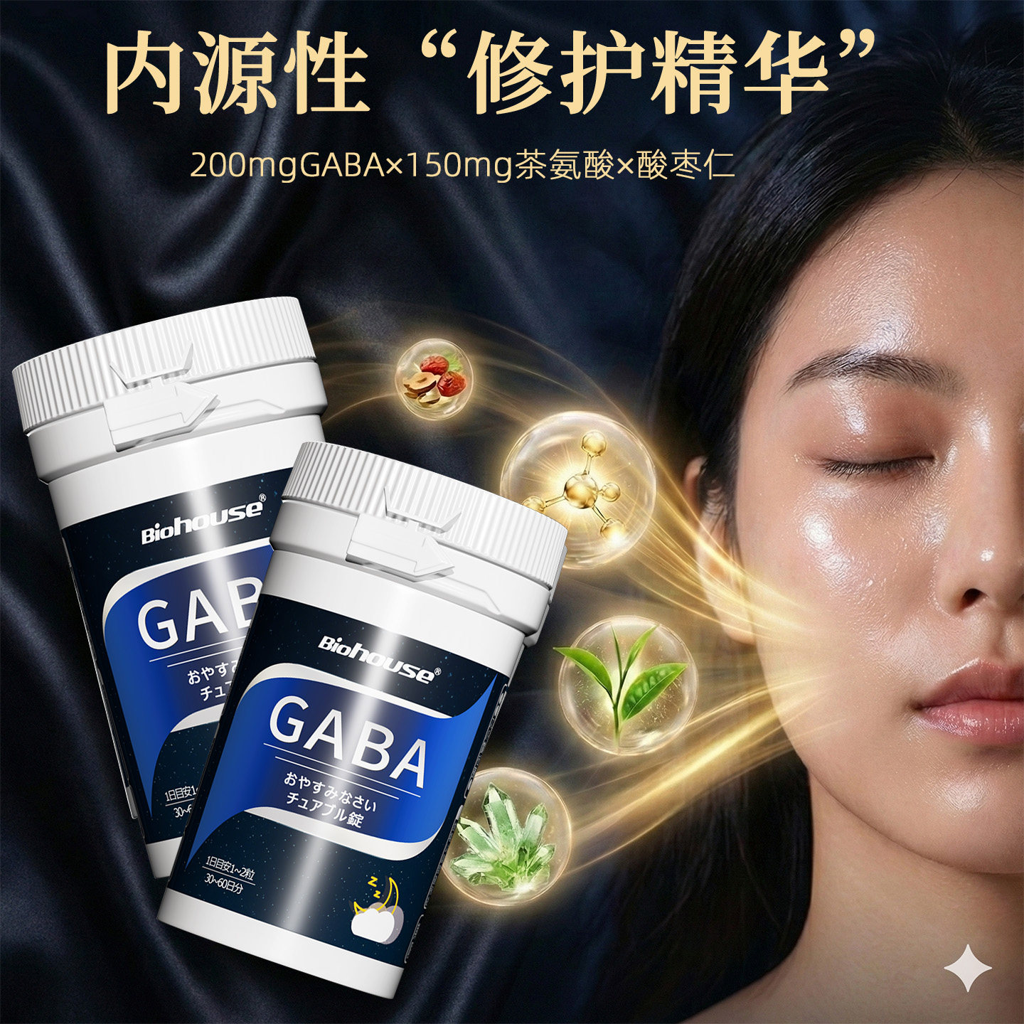 Biohouse氨基丁酸GABA茶氨酸非褪黑素葡萄籽软糖内服晚安片2瓶装