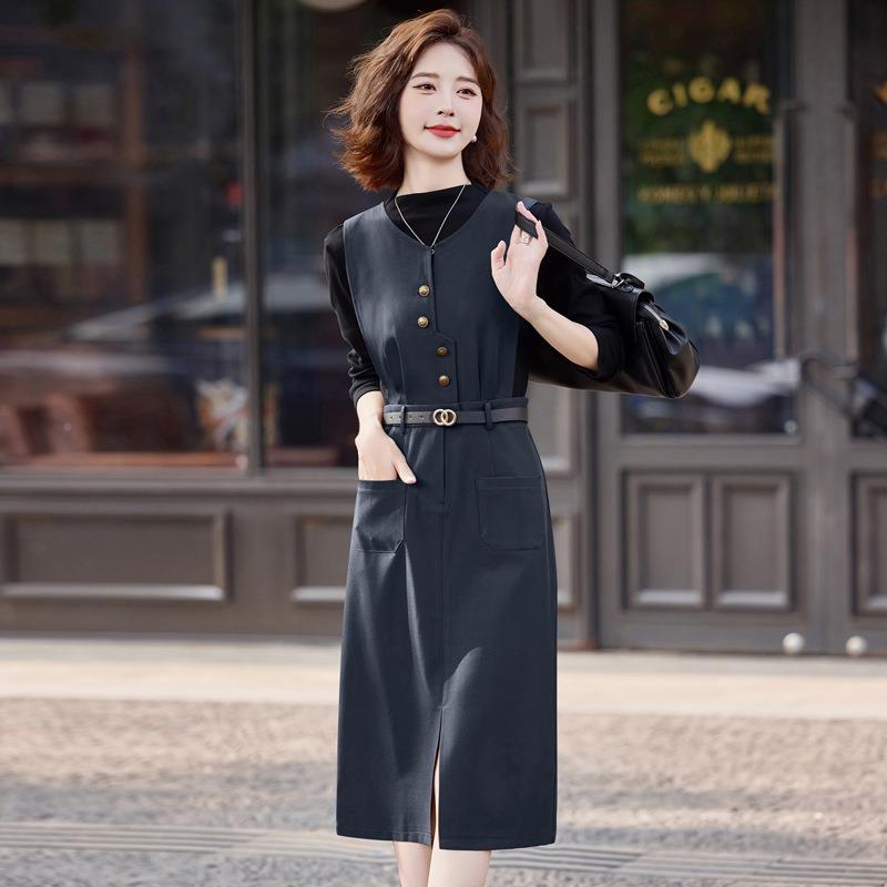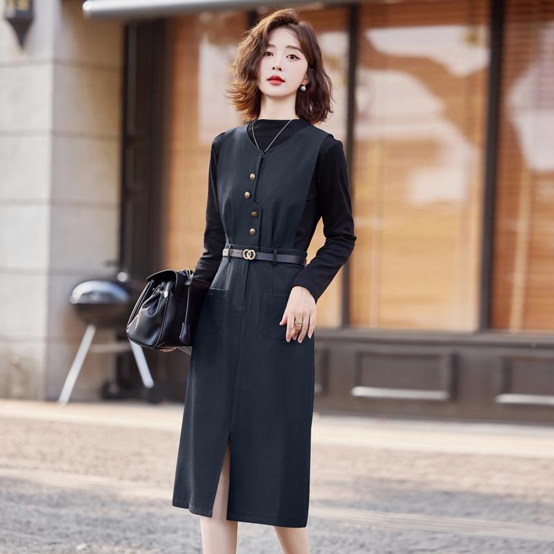 秋W5562季新款女心装高领袖打底两衫中长背裙件套时长尚连衣裙