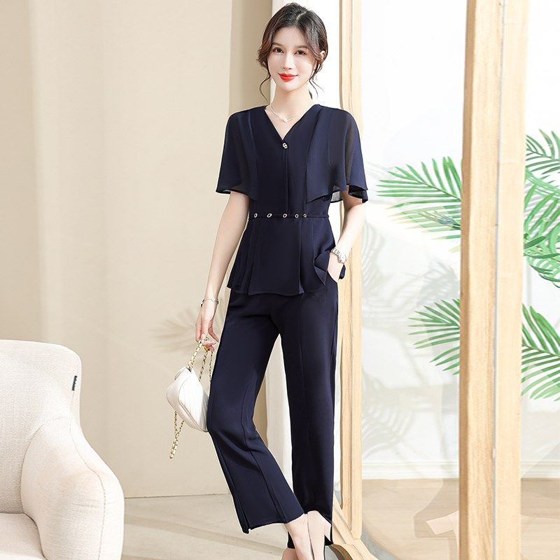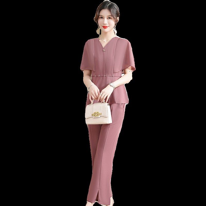 妈妈装夏装2024新款洋气雪纺衫套装短袖上衣两件套夏季中老年女装