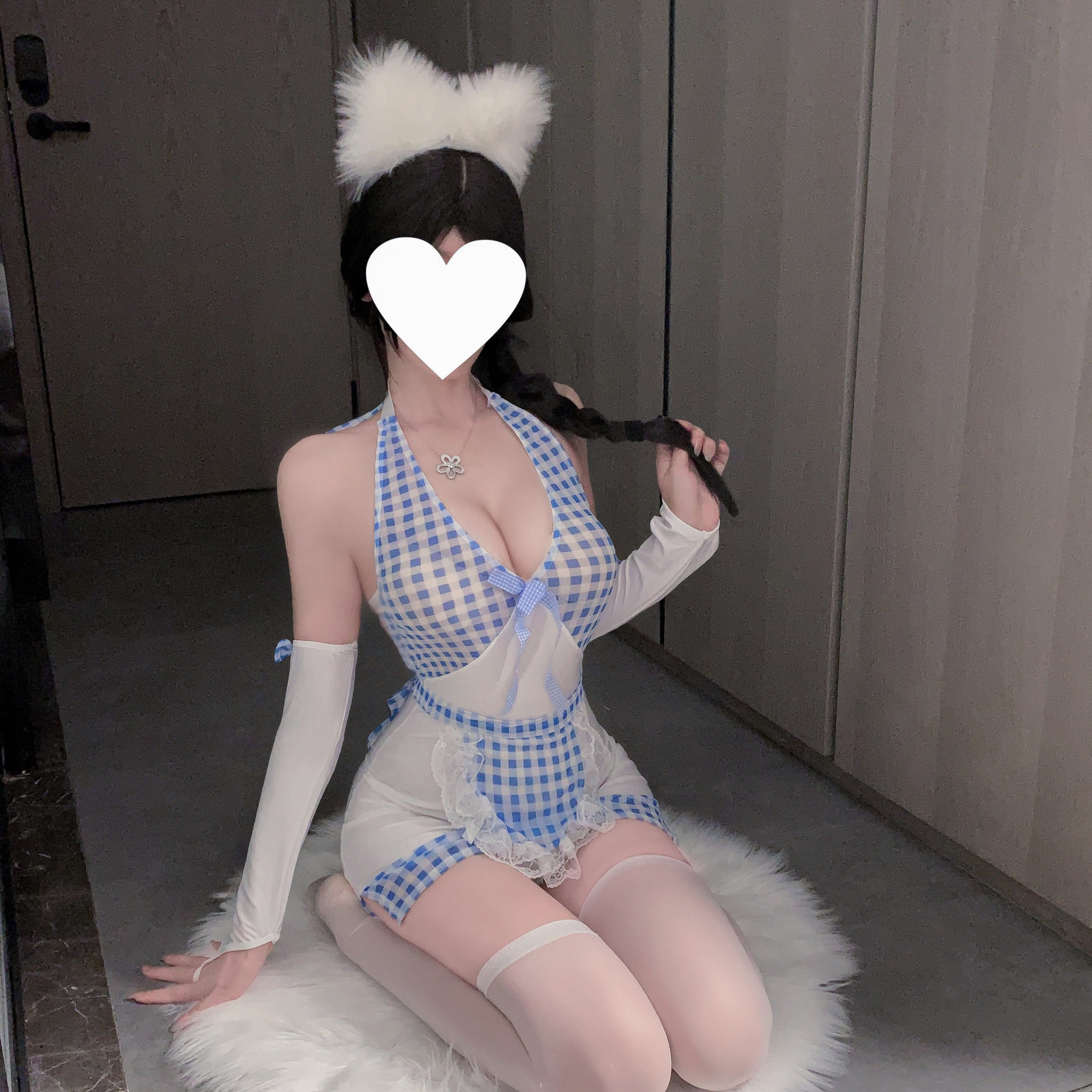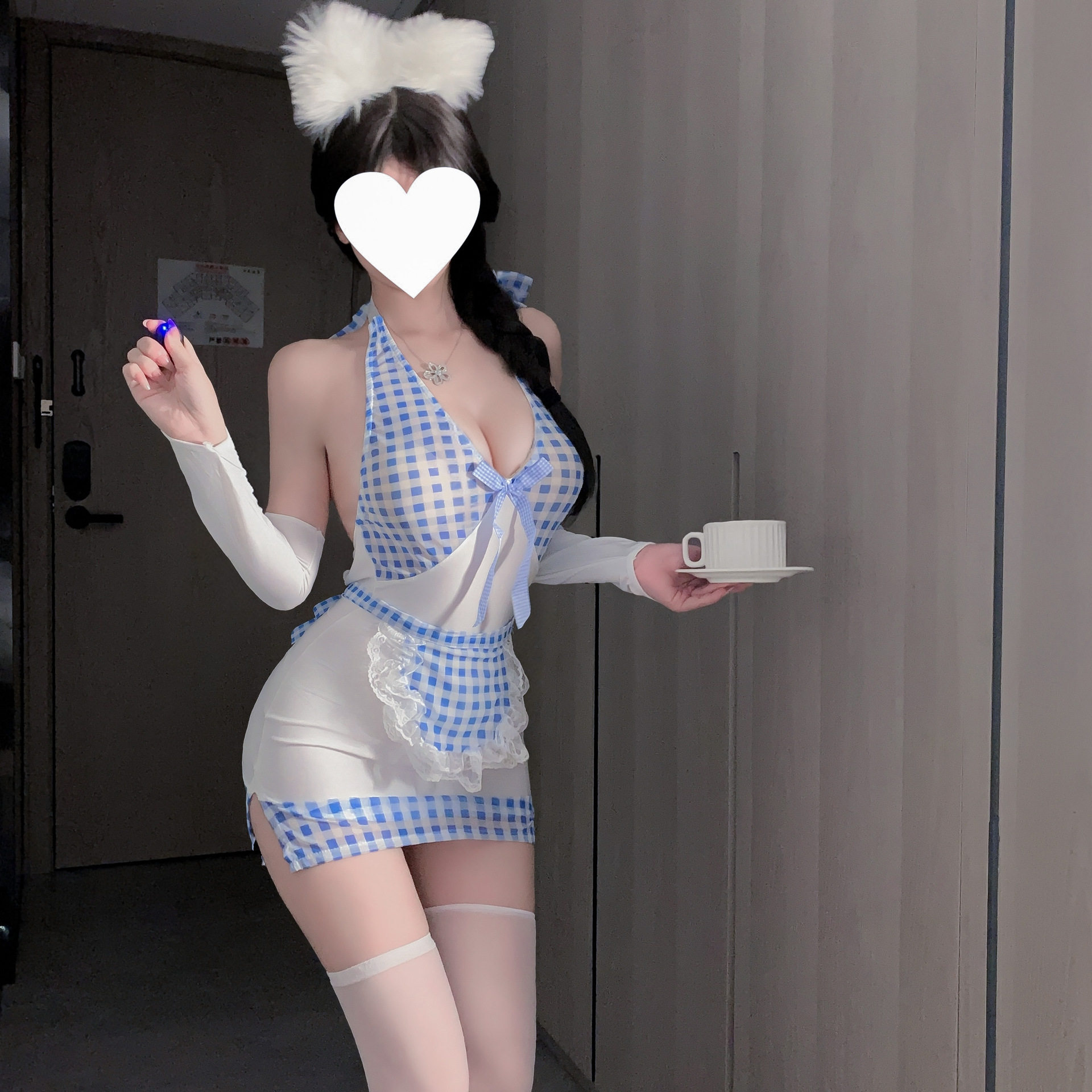 纯欲性感深V挂脖透视蓝色格纹包臀裙甜美女仆诱惑制服私房内衣女
