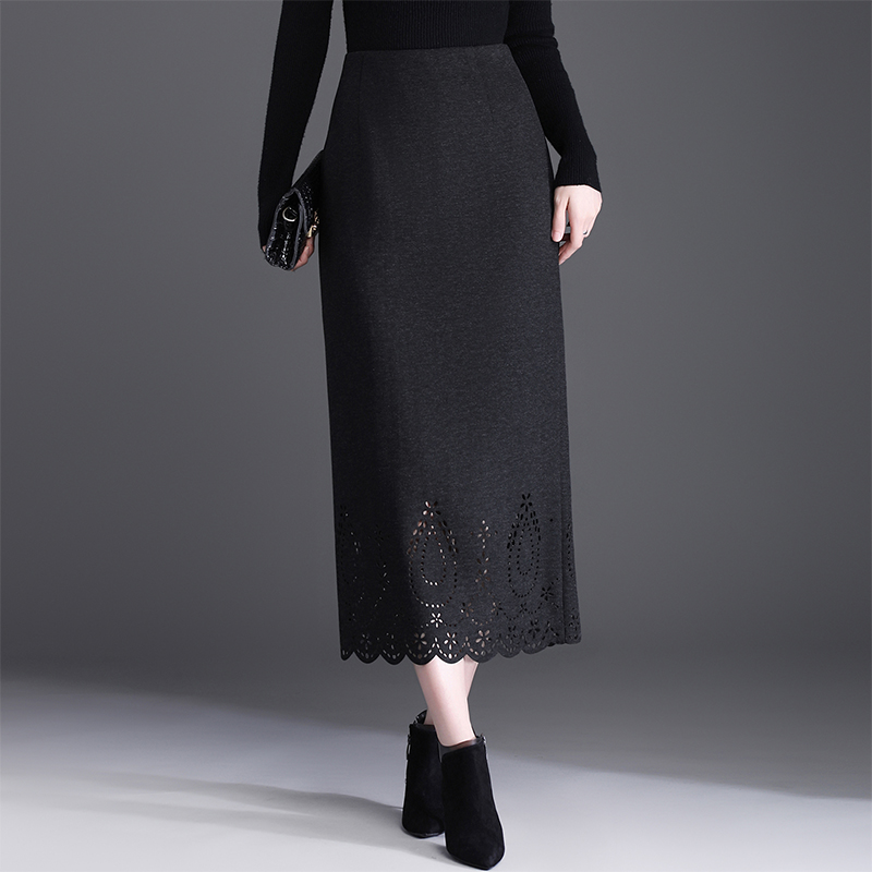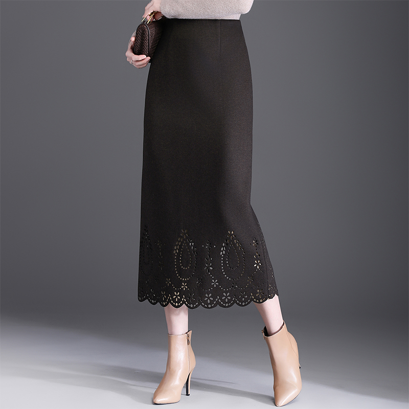 韩式新款毛呢半身裙女秋冬裙子长裙高腰显瘦镂空时尚包臀裙一步裙