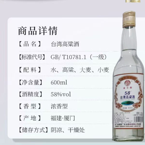 台湾高粱酒58度600ml浓香型高度白酒固态法粮食酒整箱12瓶泡药酒
