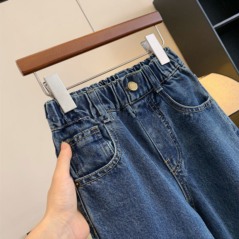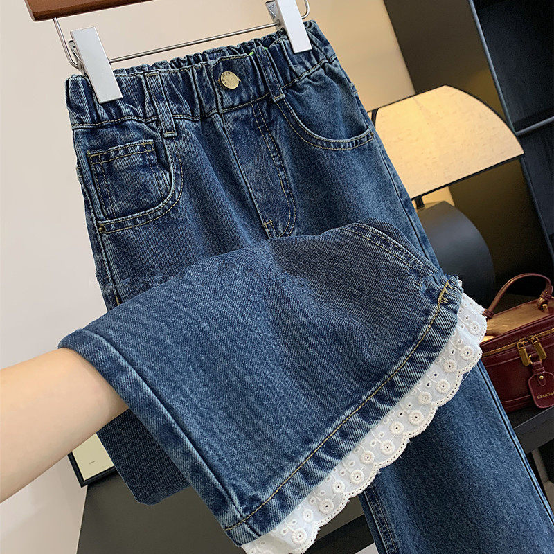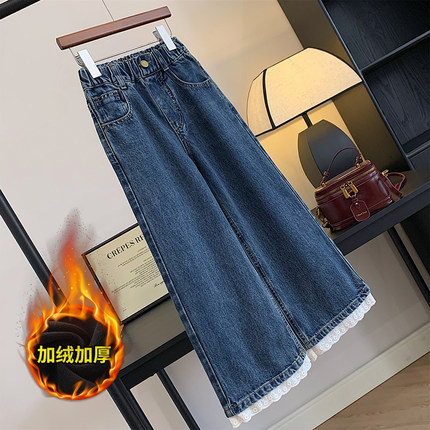 2025冬季女中大童加绒一体绒裤子牛仔直筒裤女孩洋气休闲裤阔腿裤