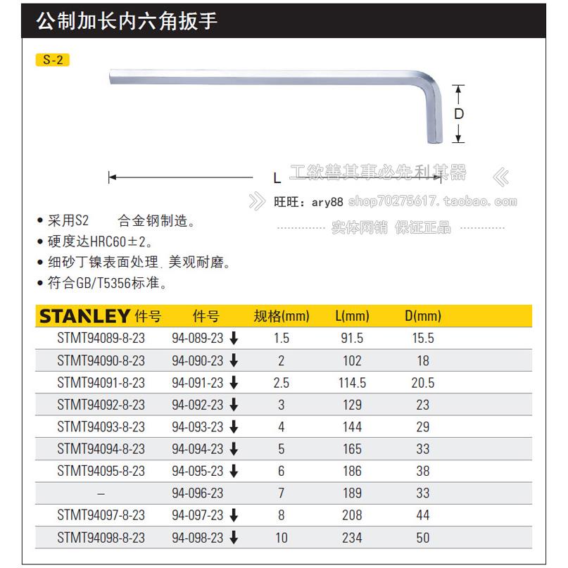STANLEY史丹利 公制加长内六角扳手1.5MM/2/2.5/3/4/5/6/7/8/10mm