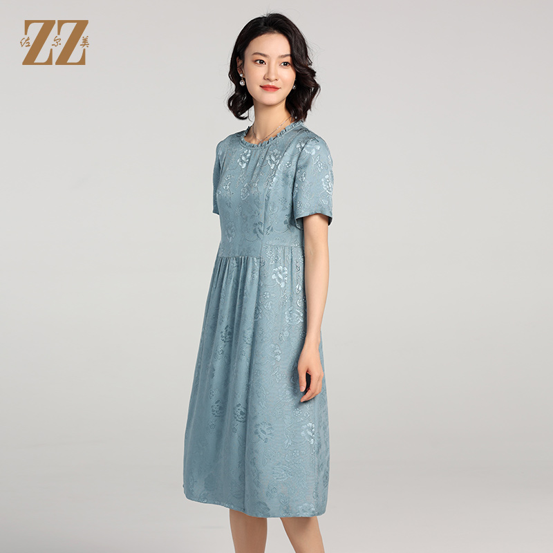 佐尔美夏季新款 花萝提花桑蚕丝真丝碎花圆领短袖连衣裙女E22LS33