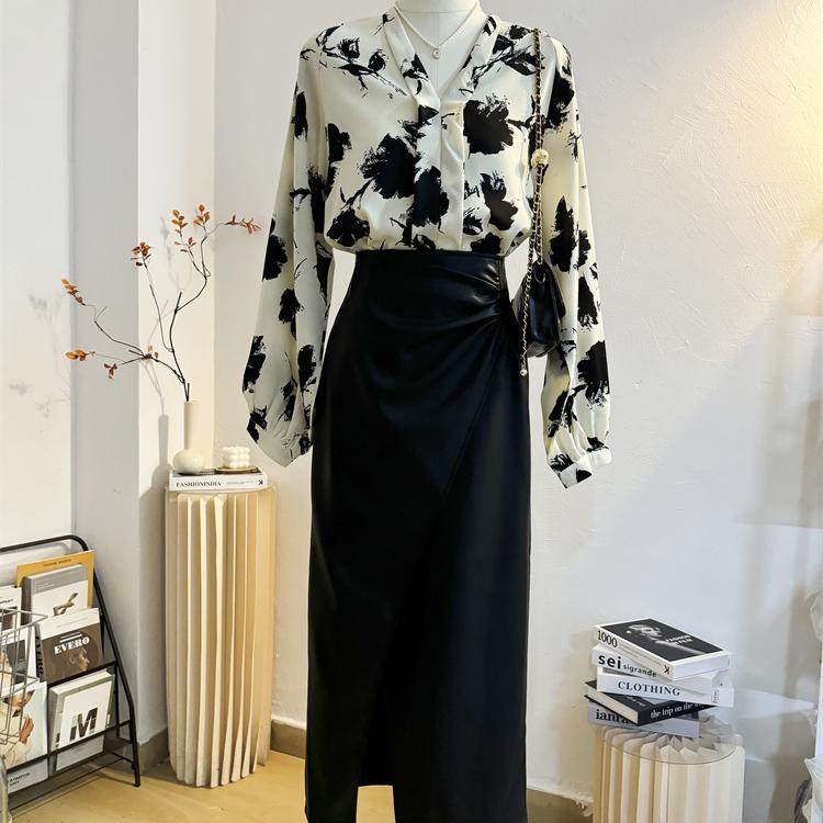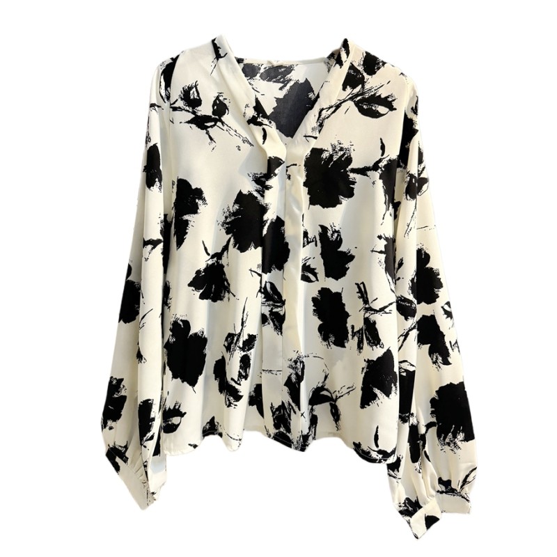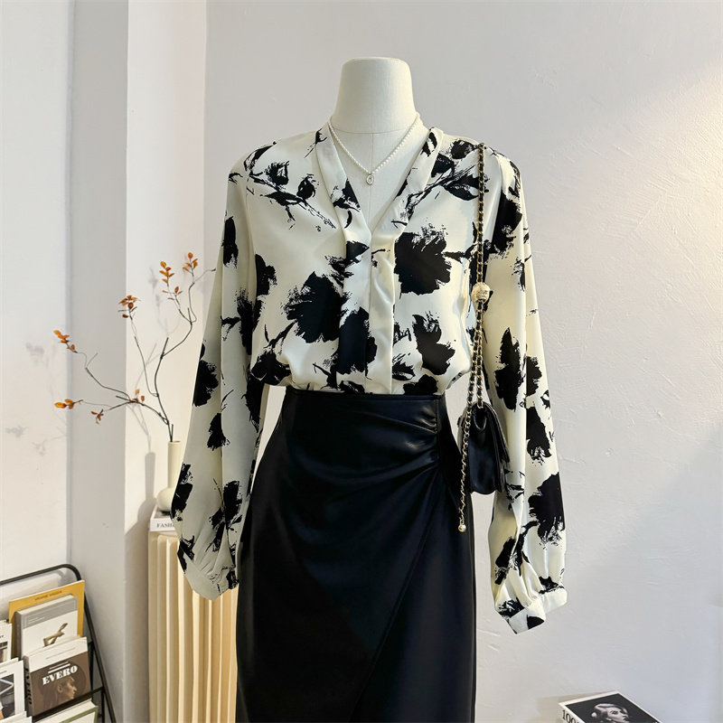 法式气质V领水墨画雪纺衫印花衬衫女2025秋宽松慵懒风灯笼袖上衣