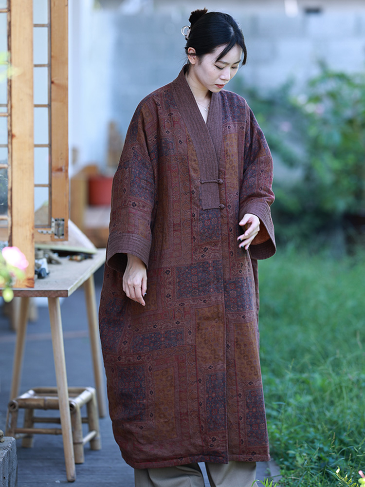 如故/听花香归野 亚麻印花复古禅意棉服长款开衫棉衣女外套袍子
