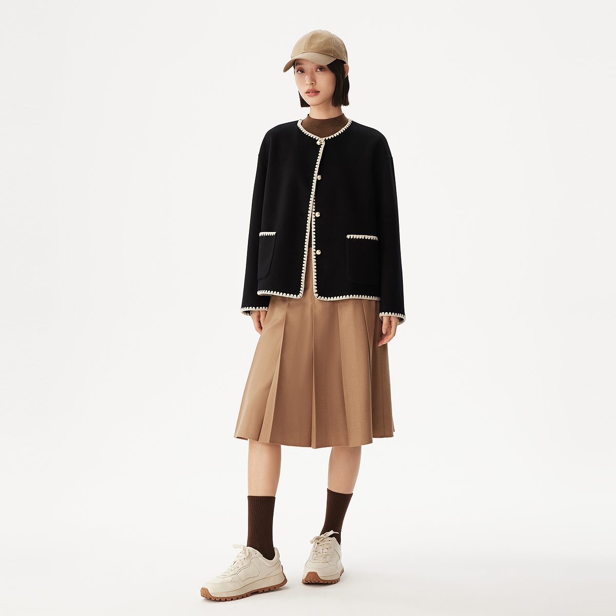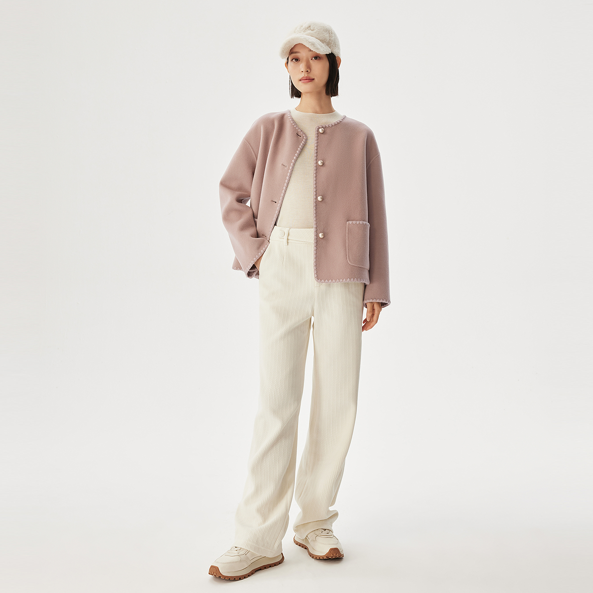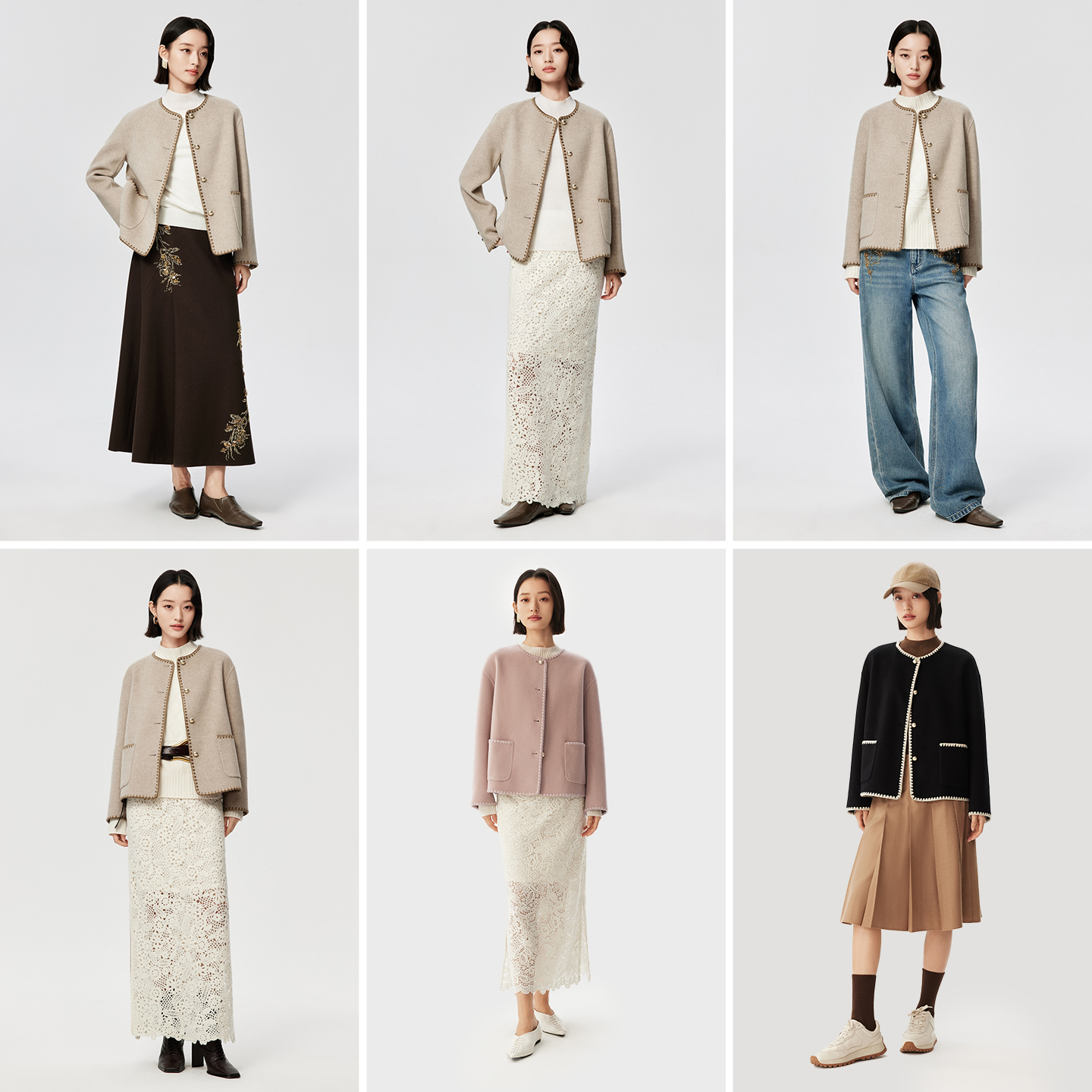 VGRASS25秋冬新款羊毛桑蚕丝双面呢COCO小香风箱型外套三色贝壳绣