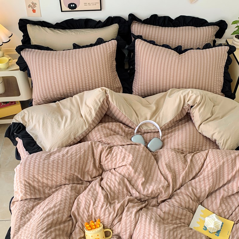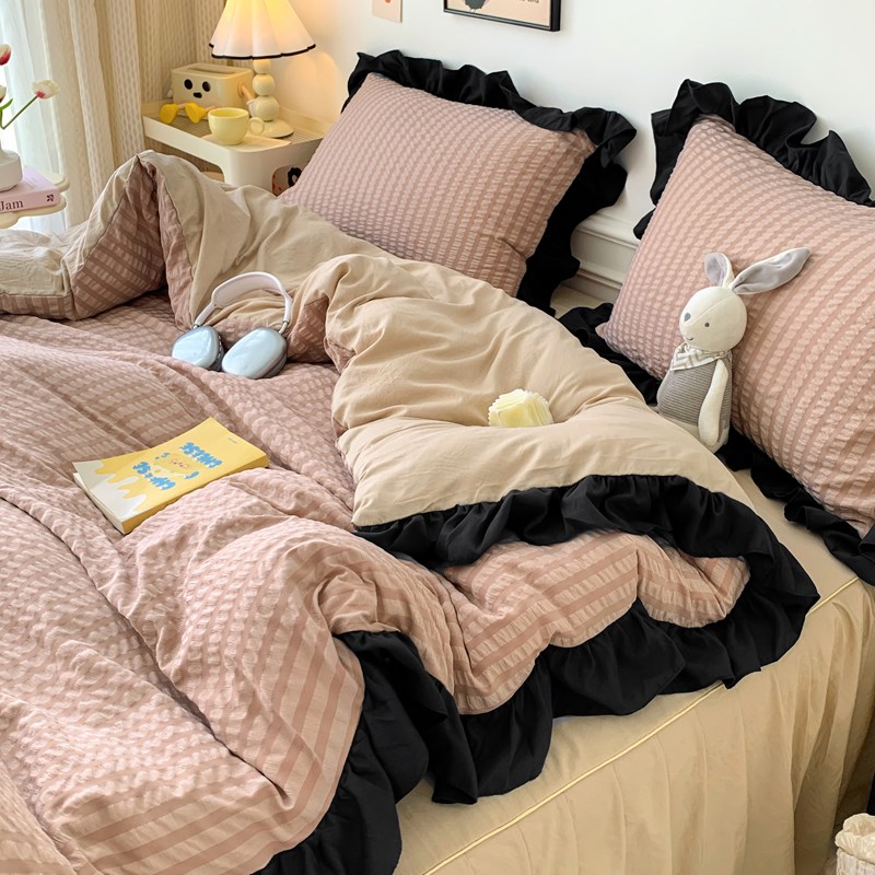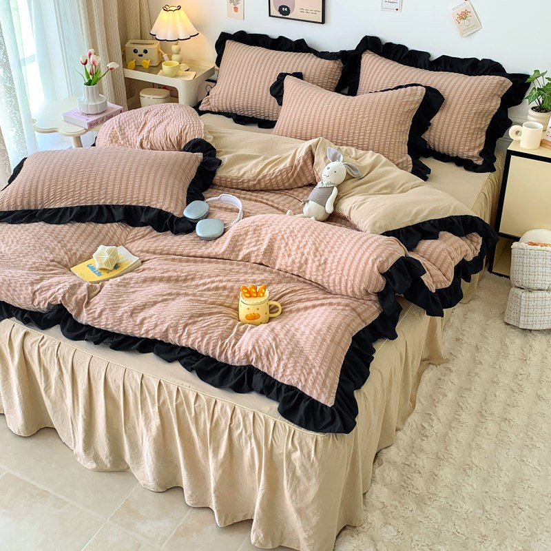韩式粉色花边公主风泡泡纱超柔四件套软糯床裙被套少女心床上用品
