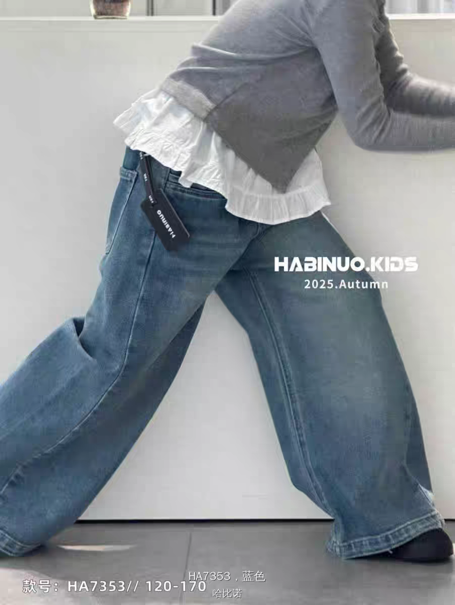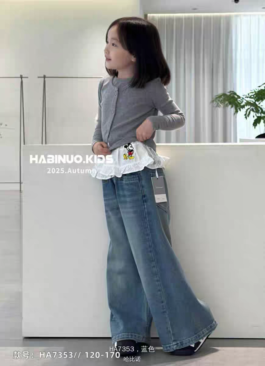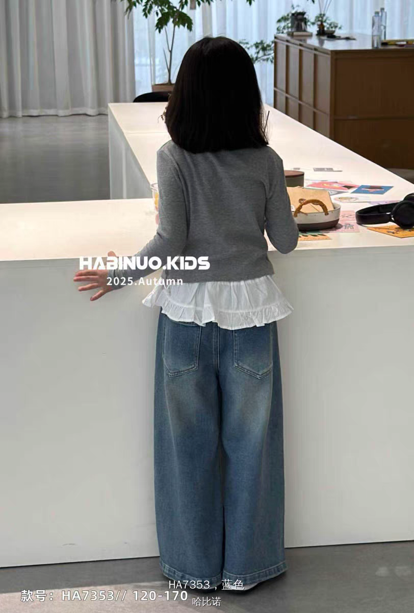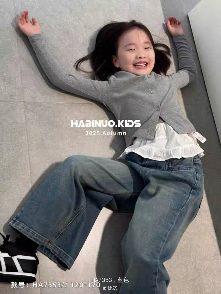 女童哈比诺纯棉浅蓝牛仔裤2025秋新品中大童直筒裤韩版宽松阔腿裤