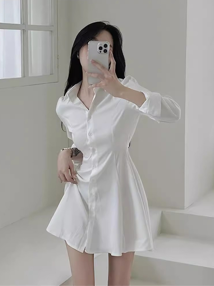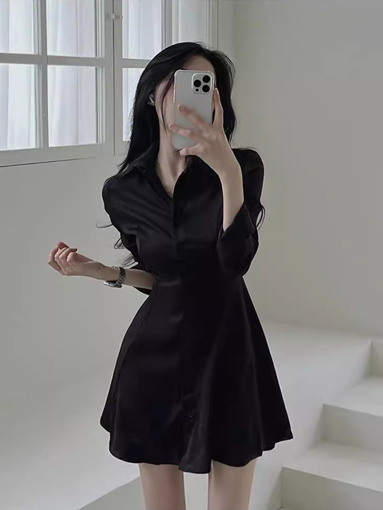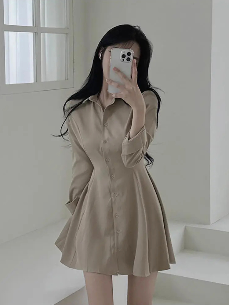 韩国chic春季新款法式气质纯色衬衫裙收腰显瘦小个子A字连衣裙女