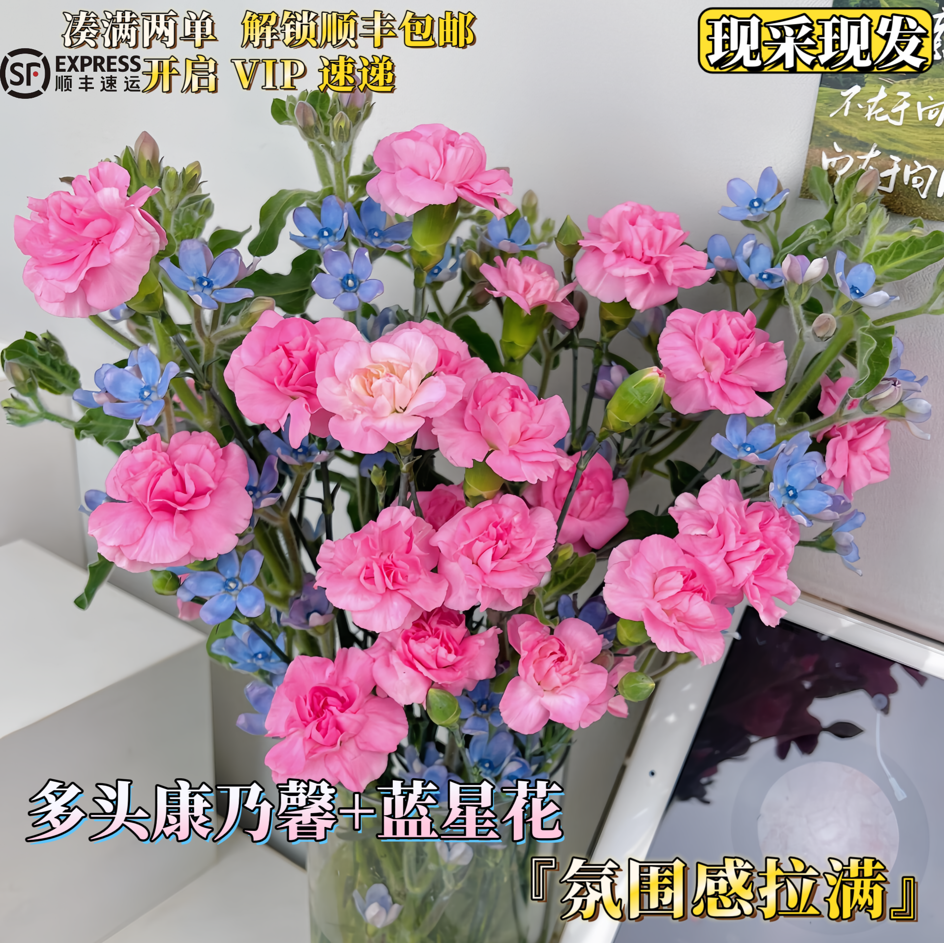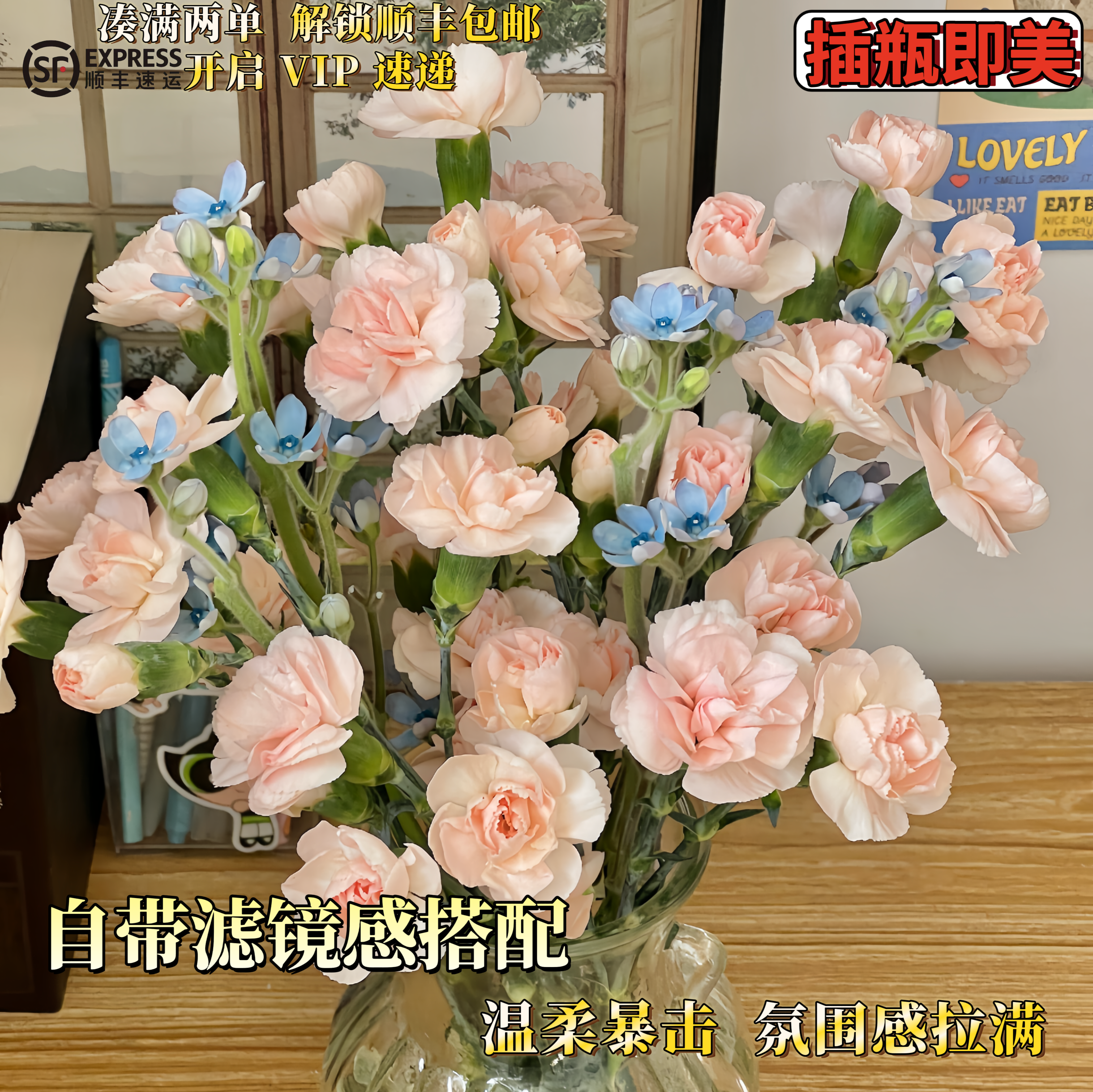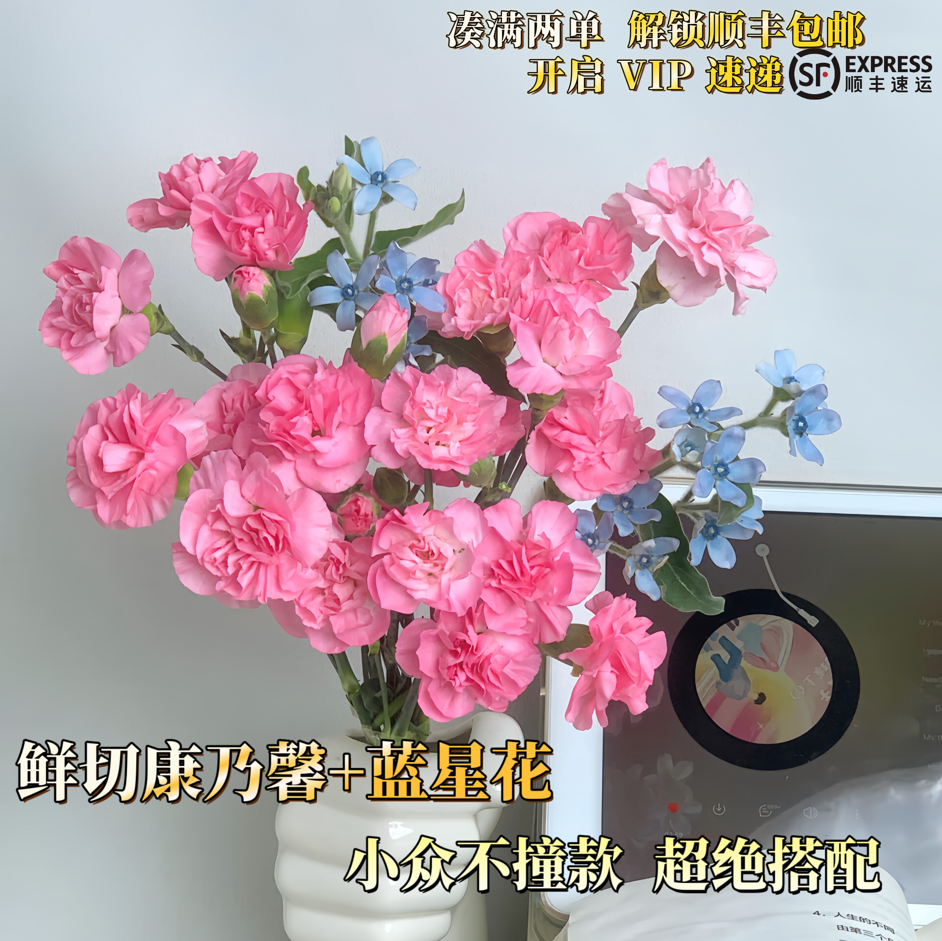康乃馨多丁搭配蓝星花粉色鲜花云南直发高级混搭花束氛围感花材