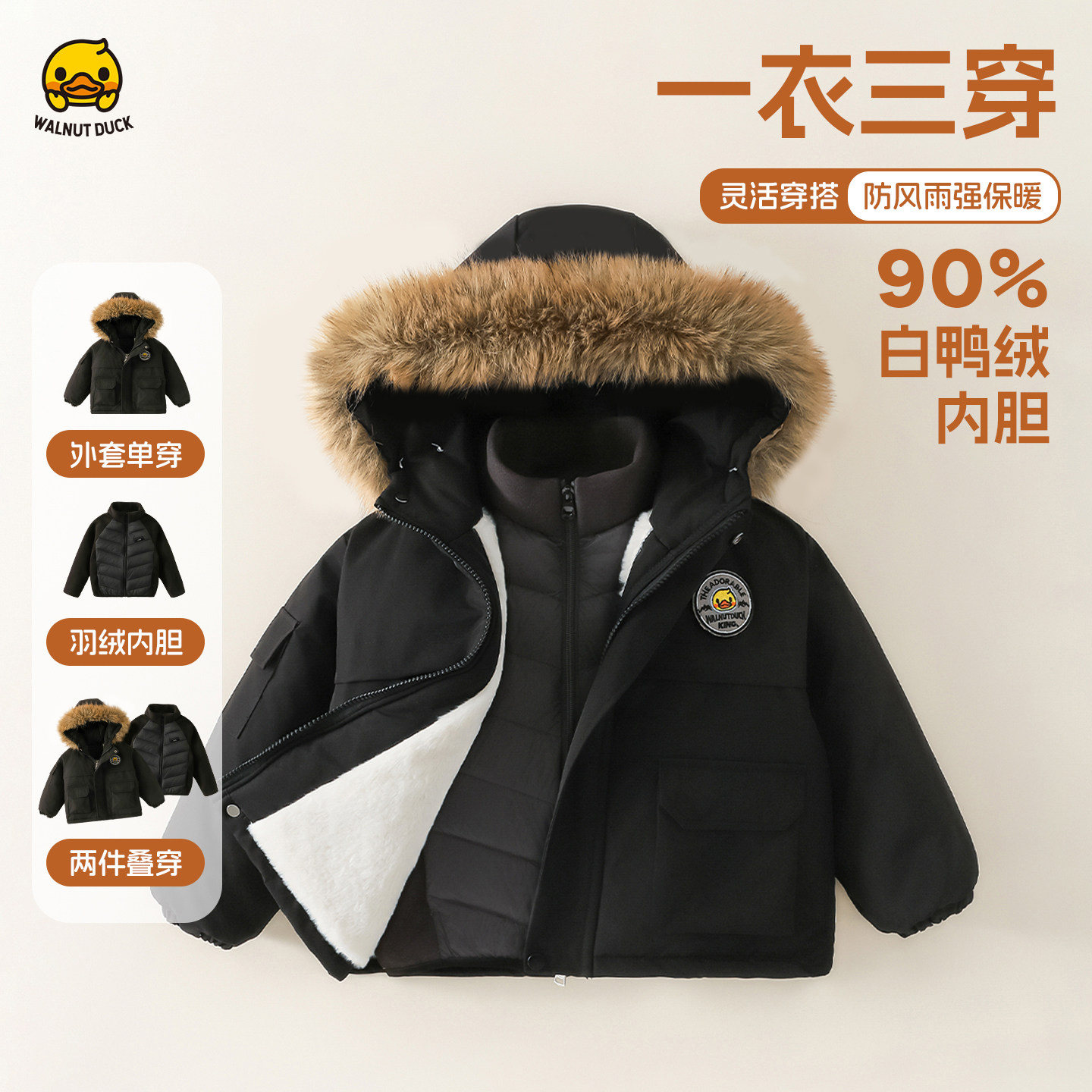 核桃小黄鸭童装新年棉服男童女童三合一加绒保暖棉衣外套羽绒内胆