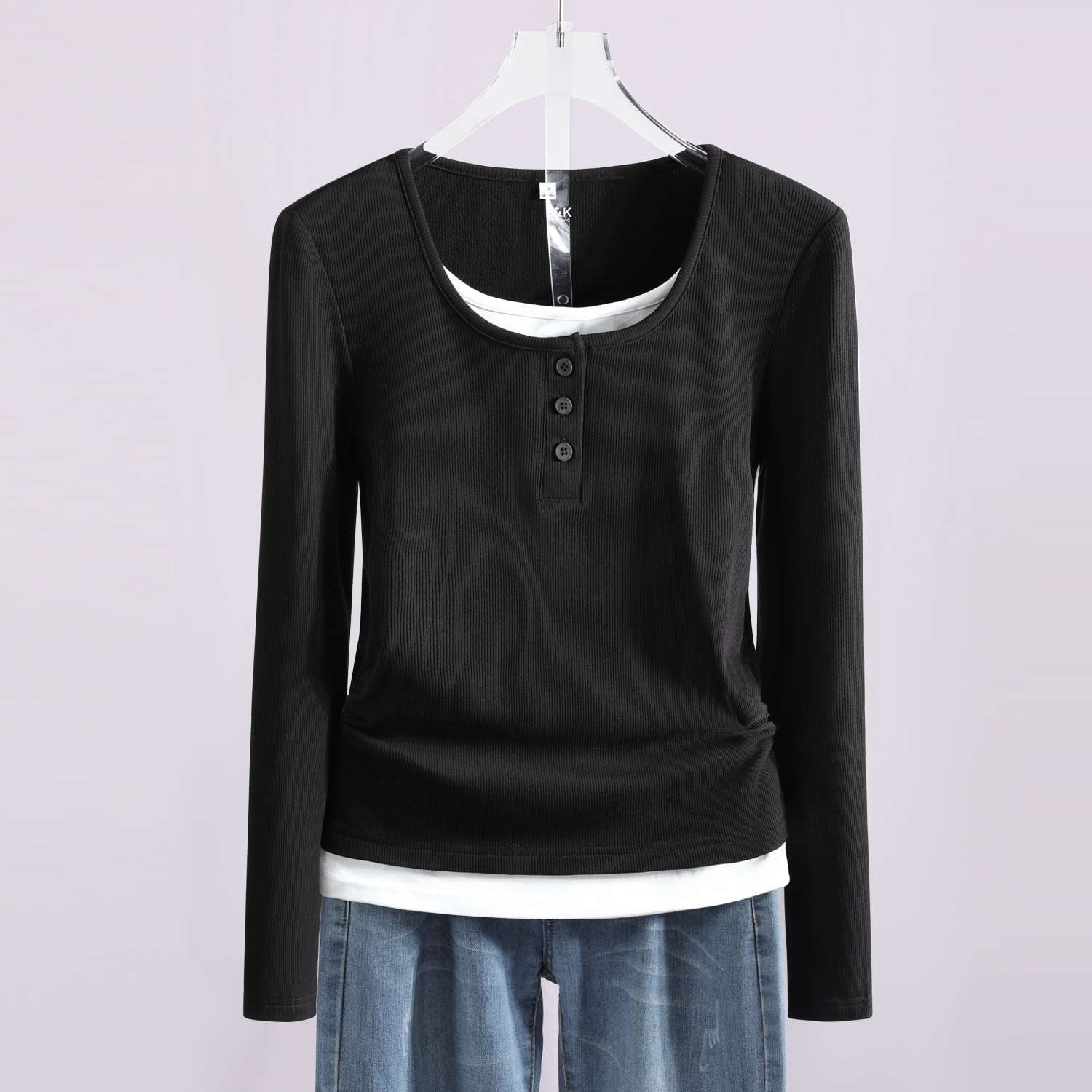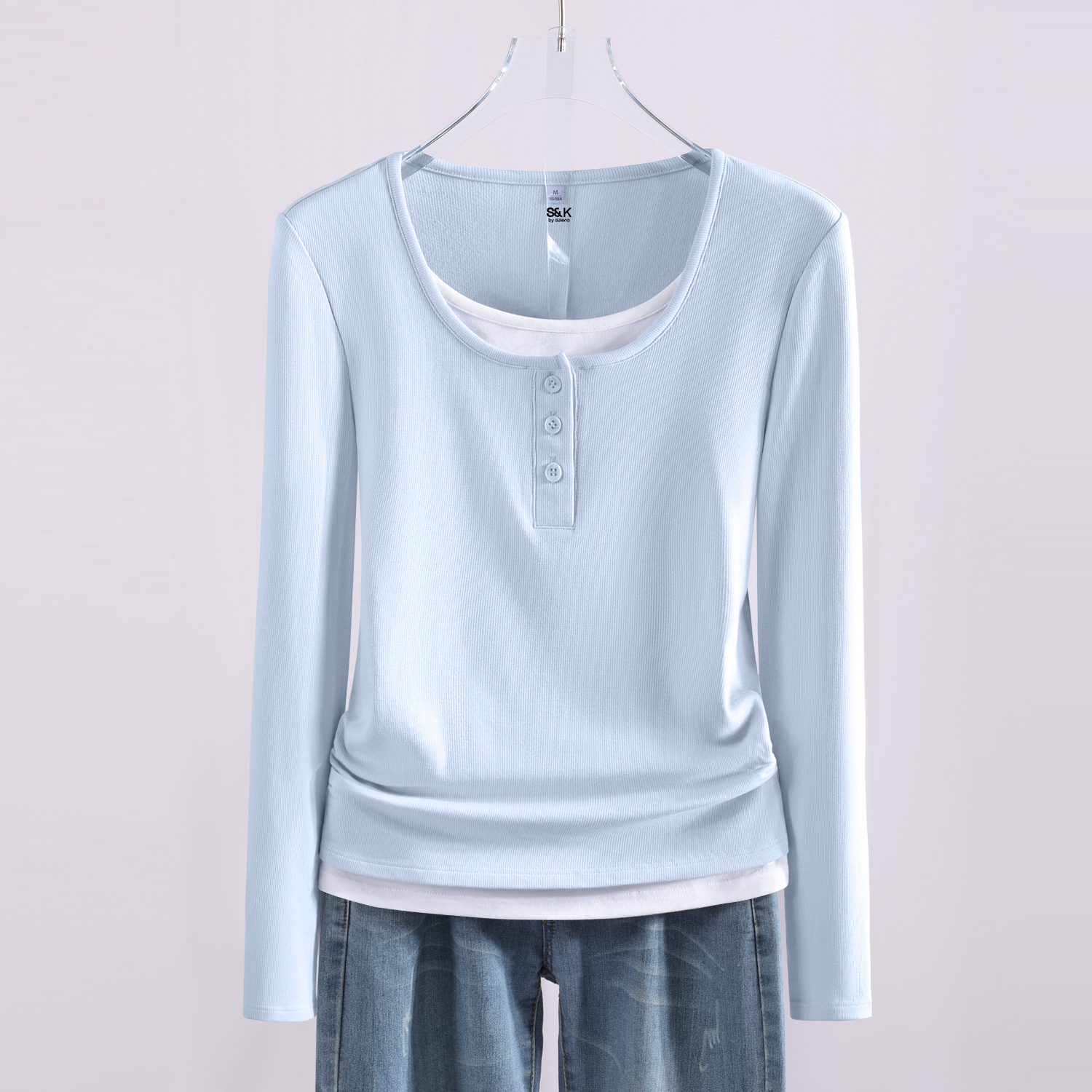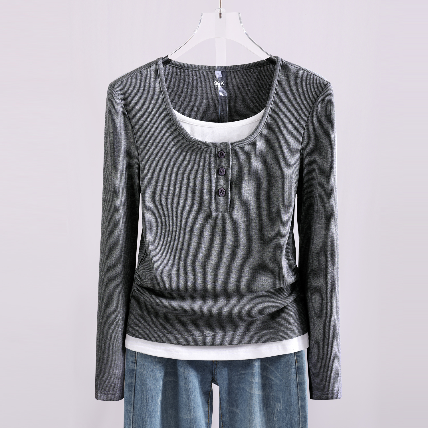 班尼路S&K系列灰色假两件打底衫女内搭2025秋季新款修身长袖t恤H