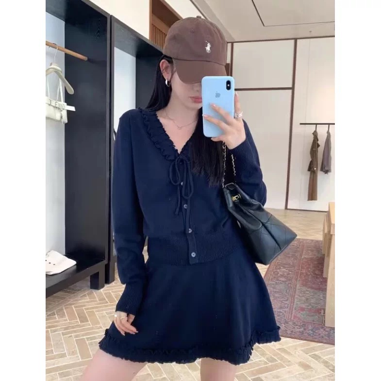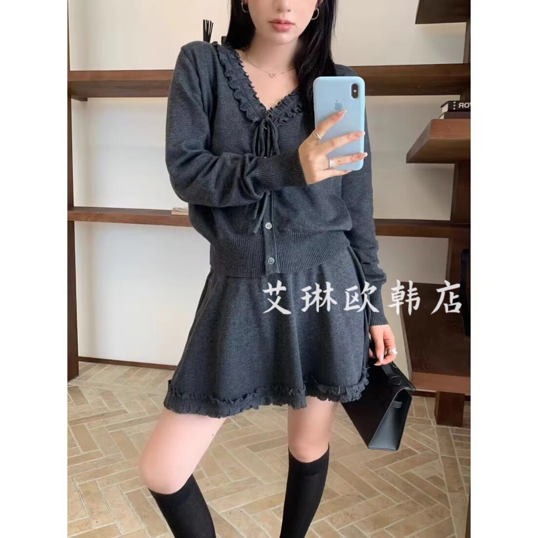 6606秋款欧货V领木耳花边绵羊毛针织开衫松紧腰A字半身裙两件套女