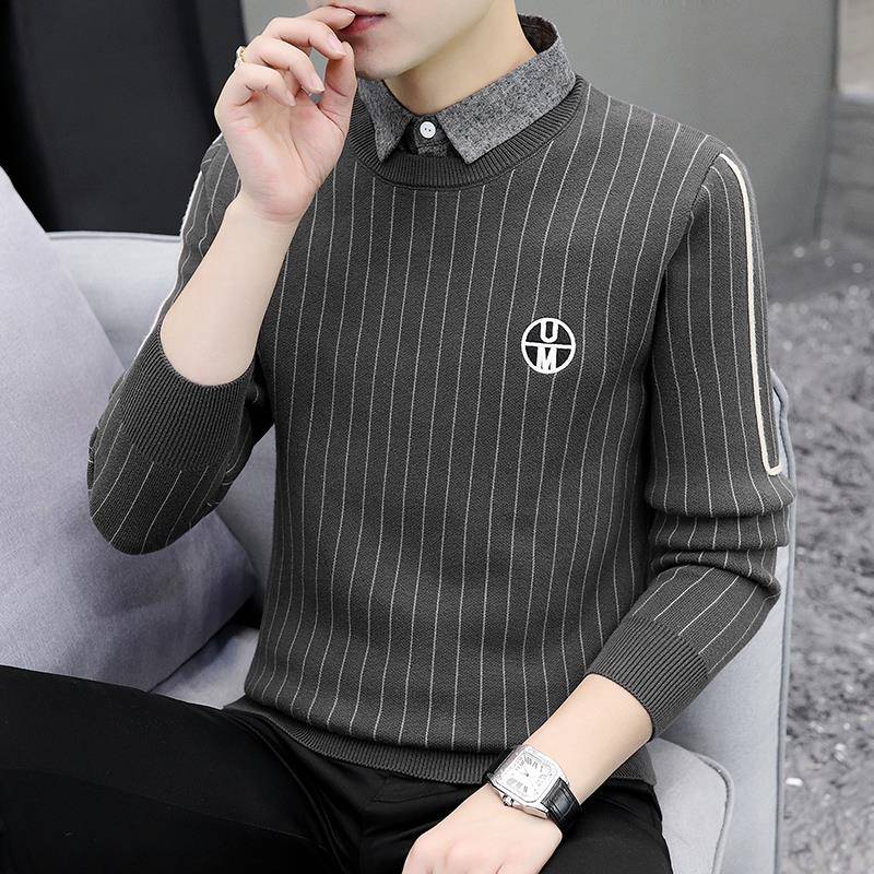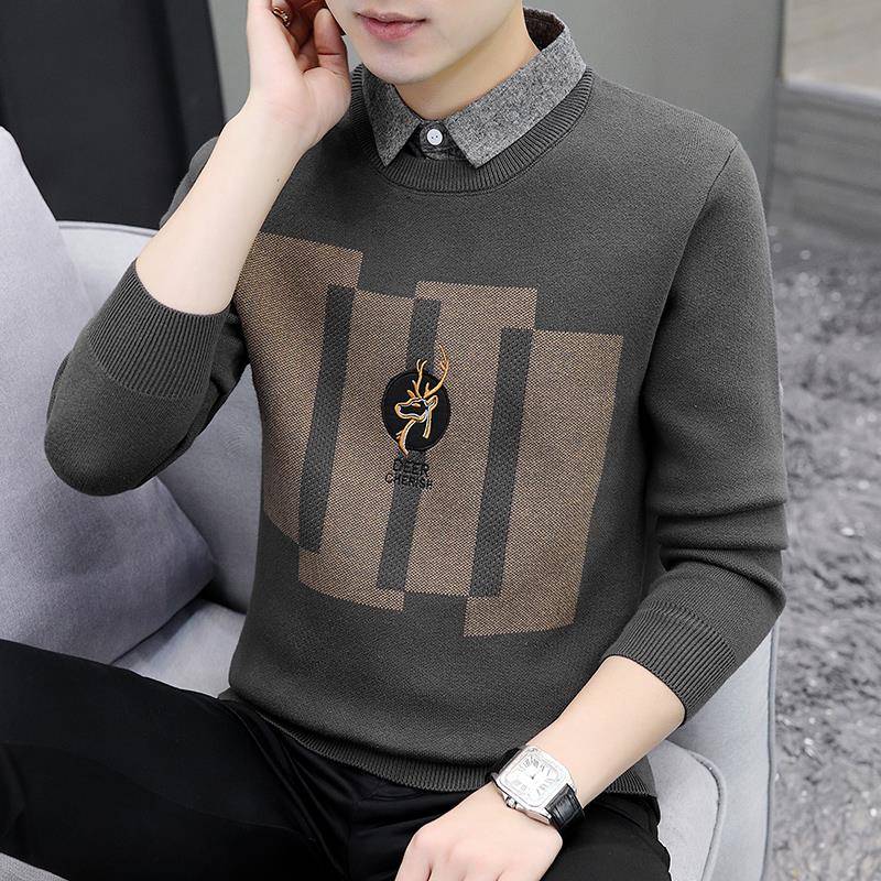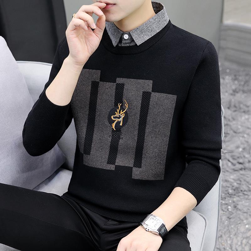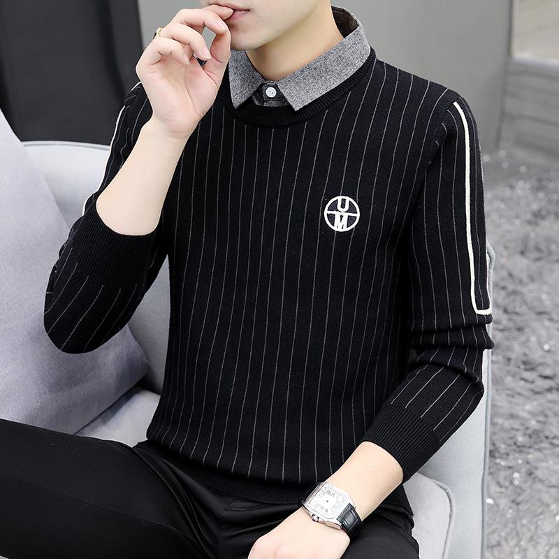 秋冬季新款假两件衬衫领卫衣打底衫男士假领加绒加厚保暖毛1010r