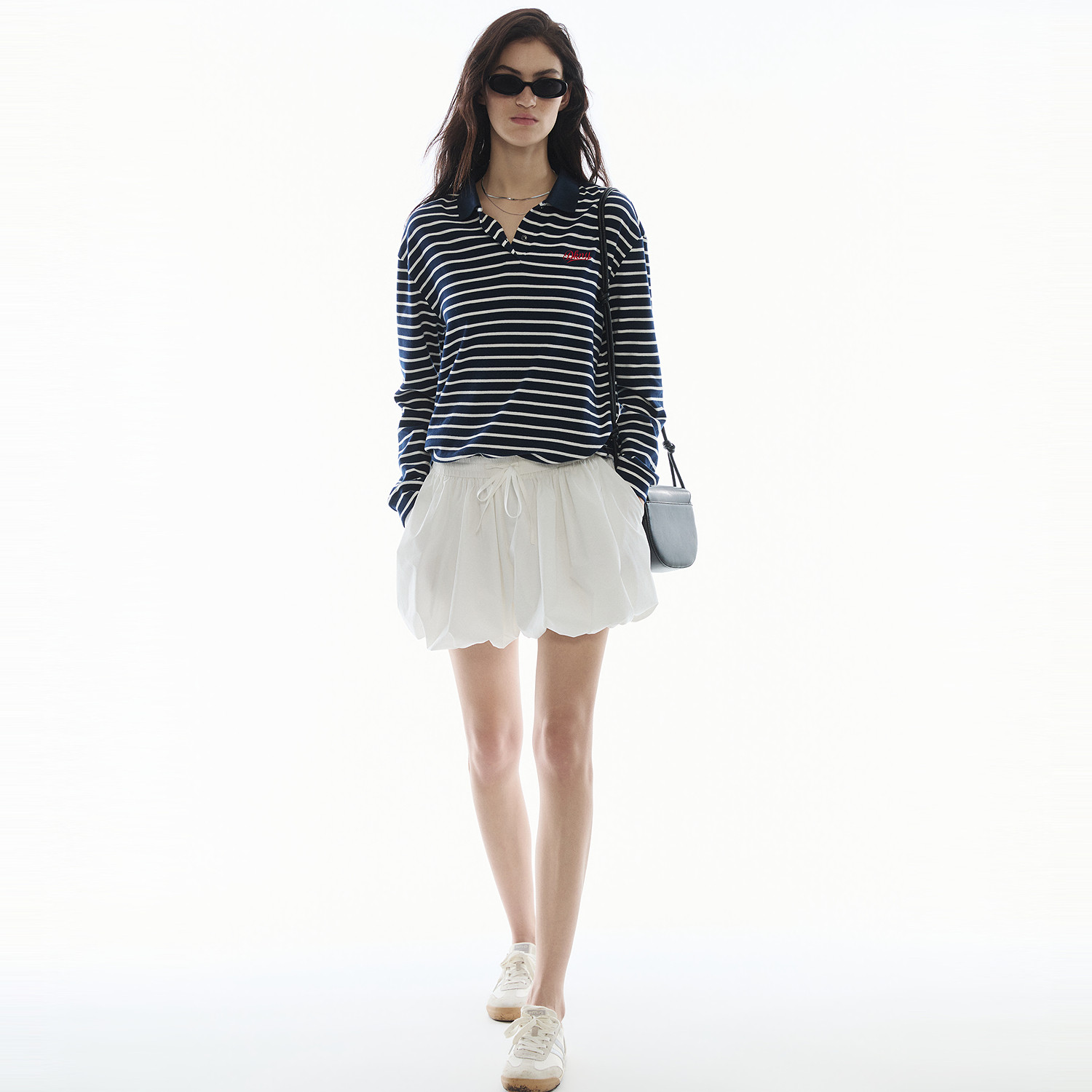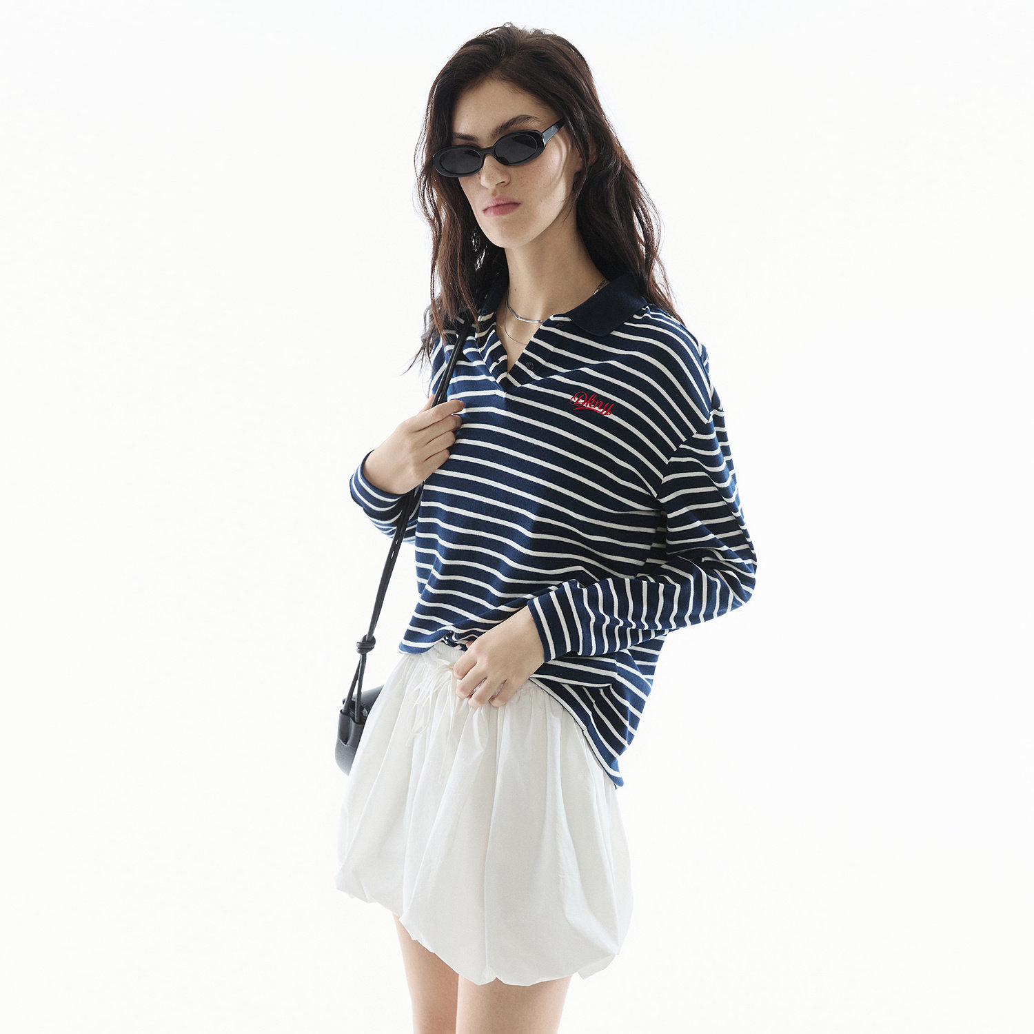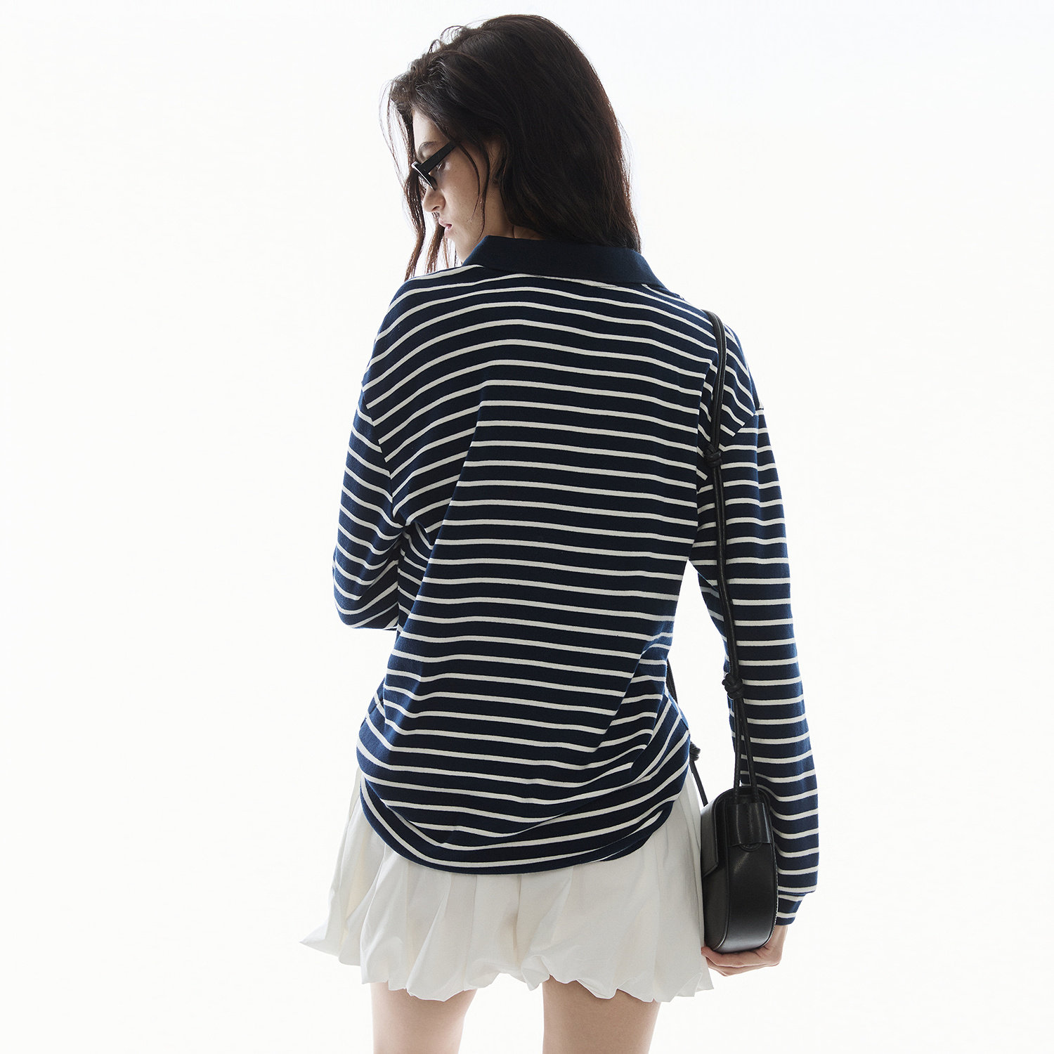 DKNY唐可娜儿26春季新款长袖polo衫女T恤藏青色横条纹宽松上衣潮