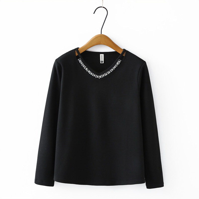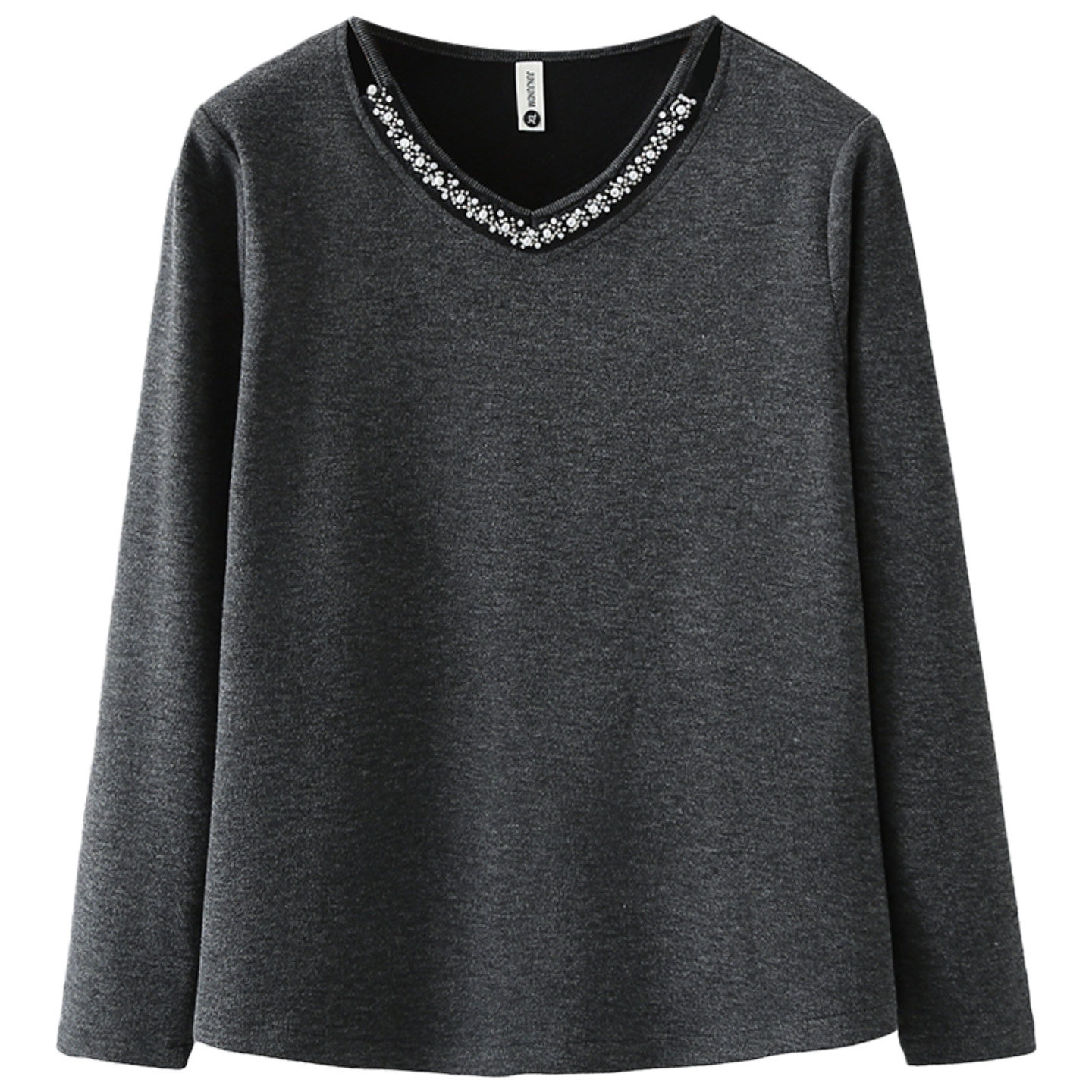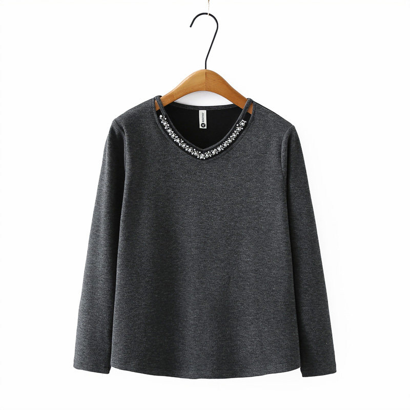 加绒加厚钉珠V领打底衫大码女装秋冬新款高档长袖T恤保暖针织上衣