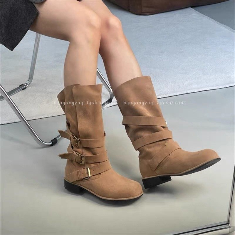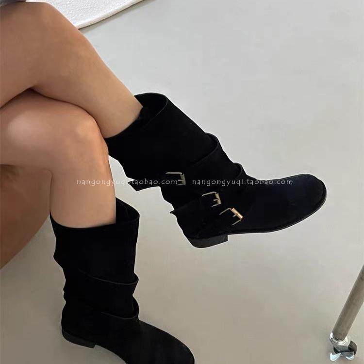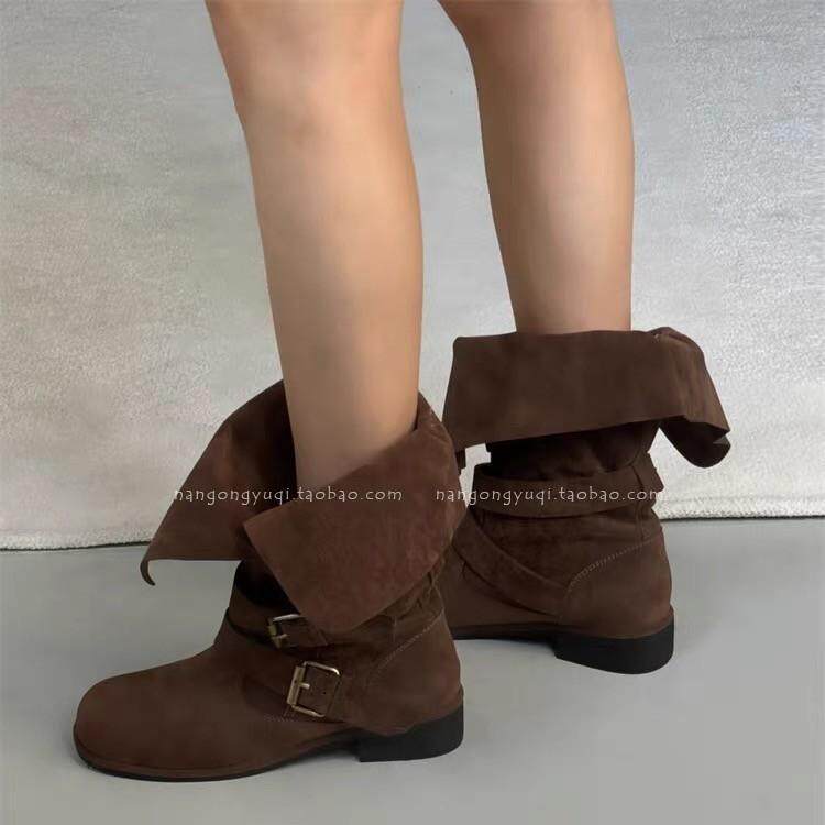 韩国东大门代购2024秋新款复古西部风圆头磨砂皮带扣挽边两穿靴子