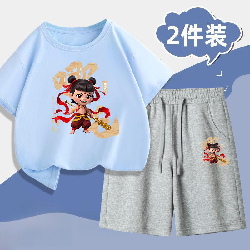 男童套装儿童亲子款加大码短袖t恤短裤两件套小哪吒衣服女孩夏装