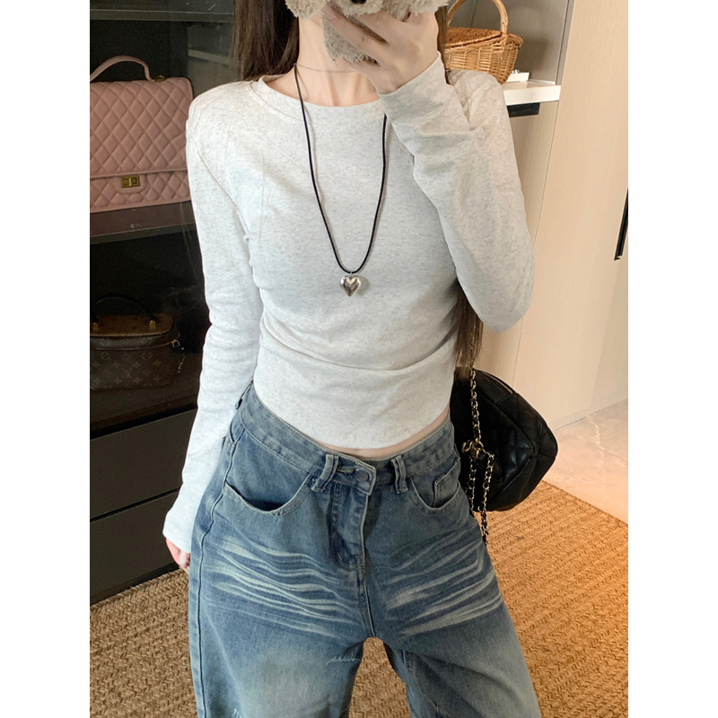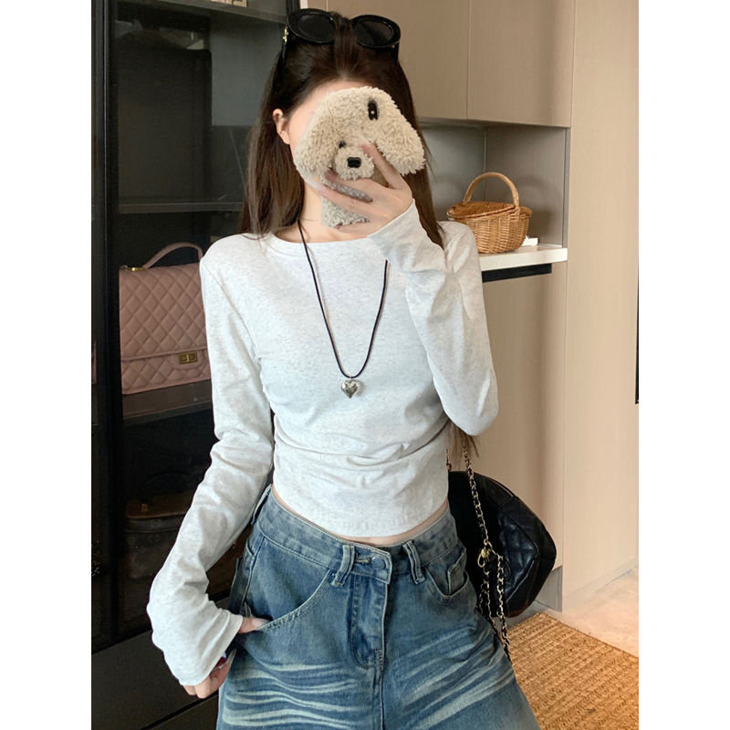 白色打底衫长袖t恤女春秋2025新款修身紧身掐腰内搭圆领正肩上衣