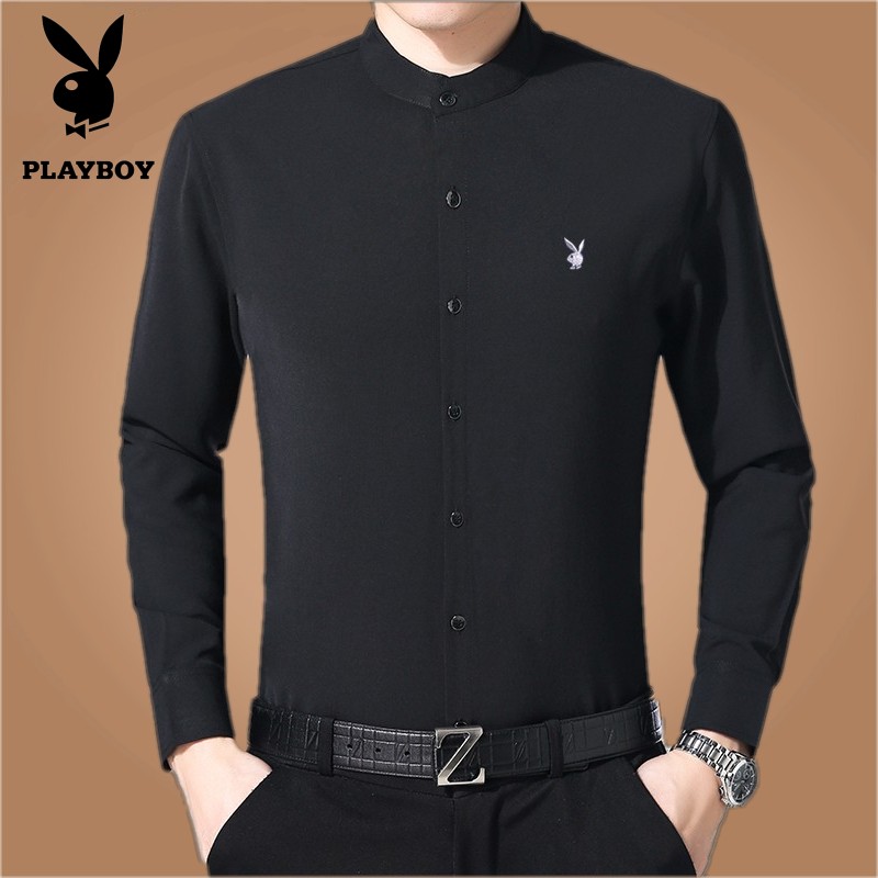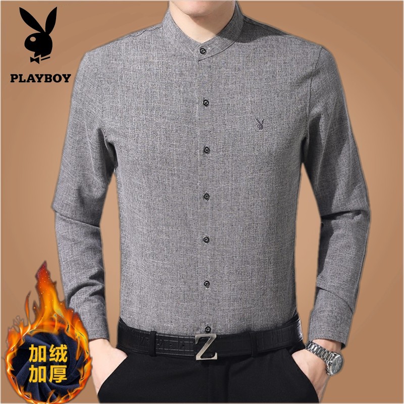 花花公子春季衬衫长袖爸爸装立领棉麻中老年亚麻衬衣百搭简约薄款