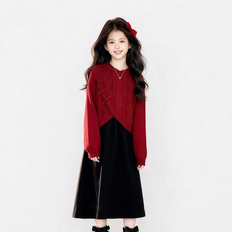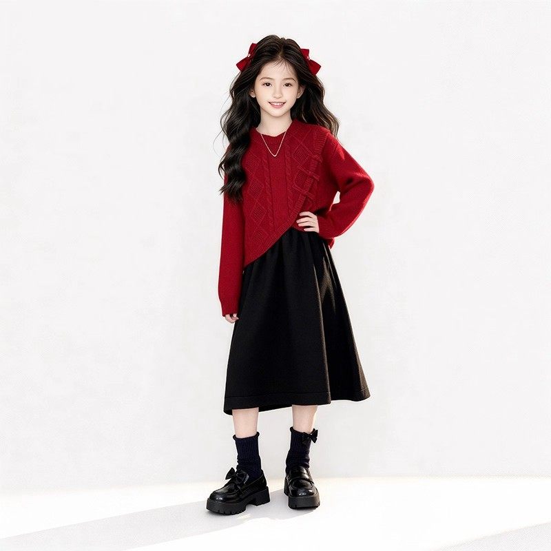 女童拜年服秋冬款2025新款中国红毛衣背心裙中大童两件套裙子套装