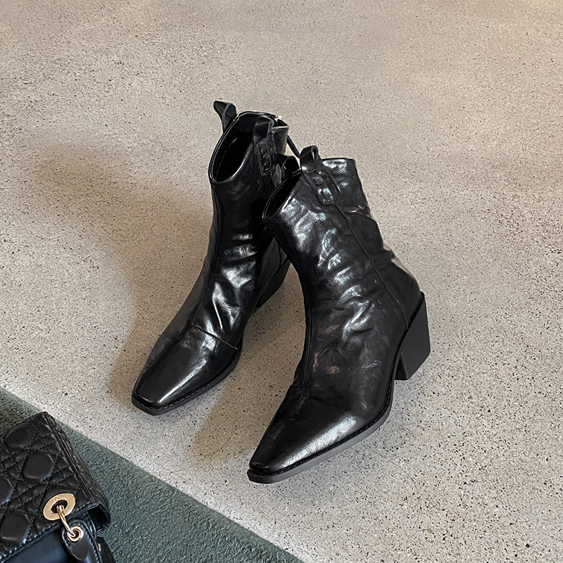 尖头马丁靴女褶皱瘦瘦靴切尔西靴