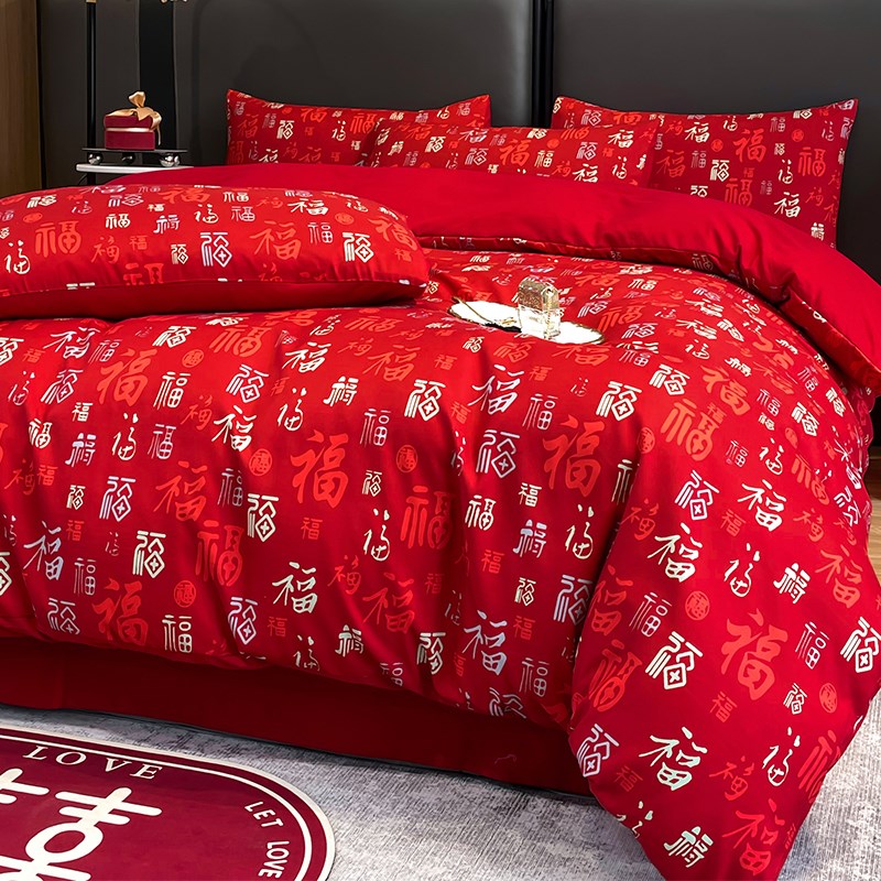 高档大红色纯棉婚庆四件套百福喜被新婚床单被套新房结婚床上用品