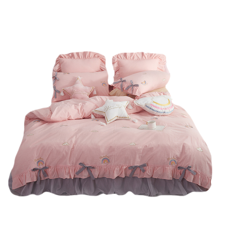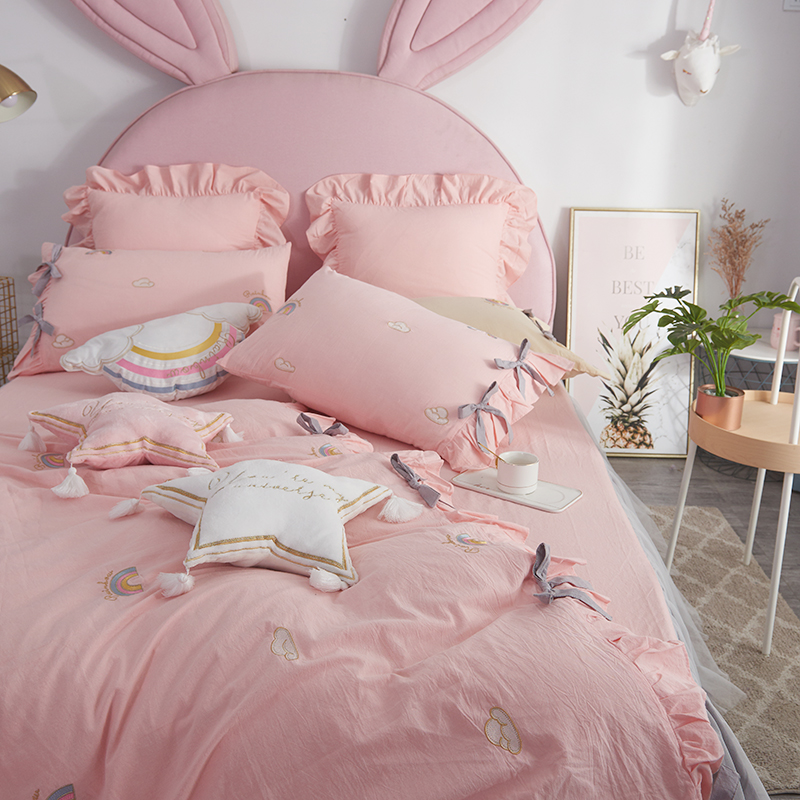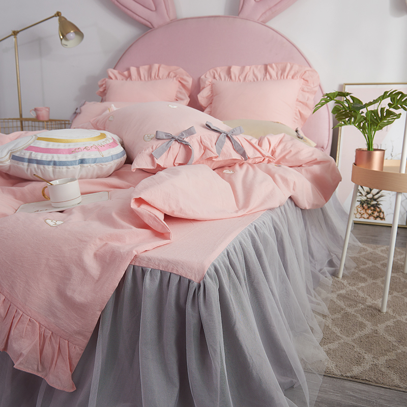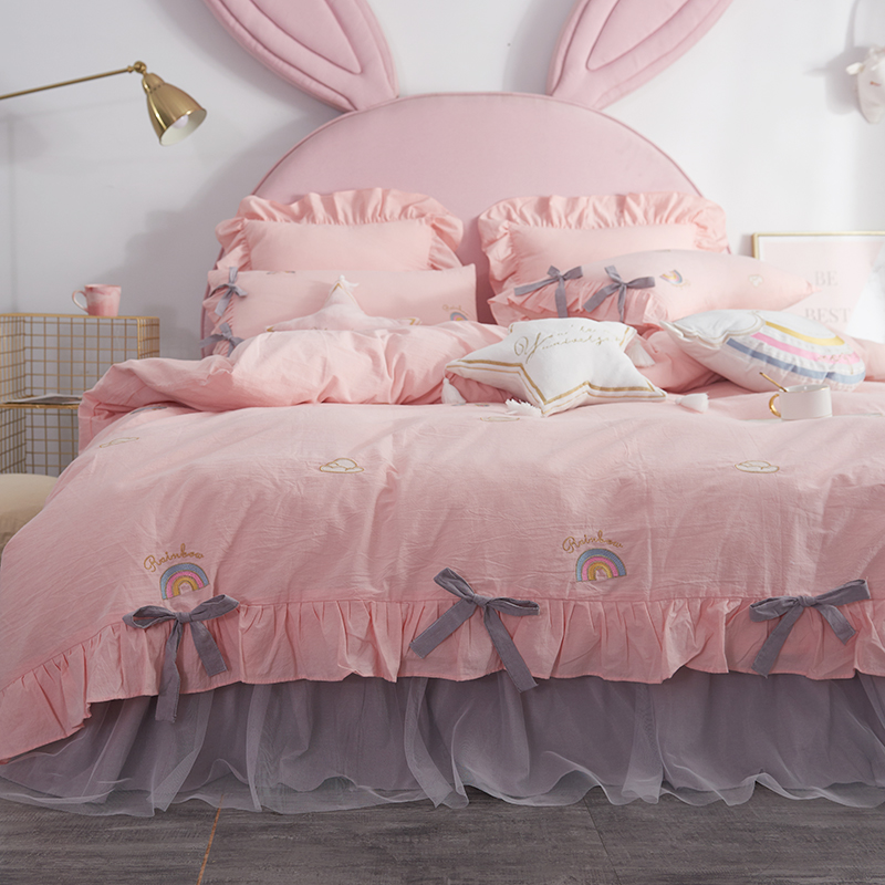 ins少女心粉色全棉水洗棉床上4四件套纯棉公主风蝴蝶结被套床裙式