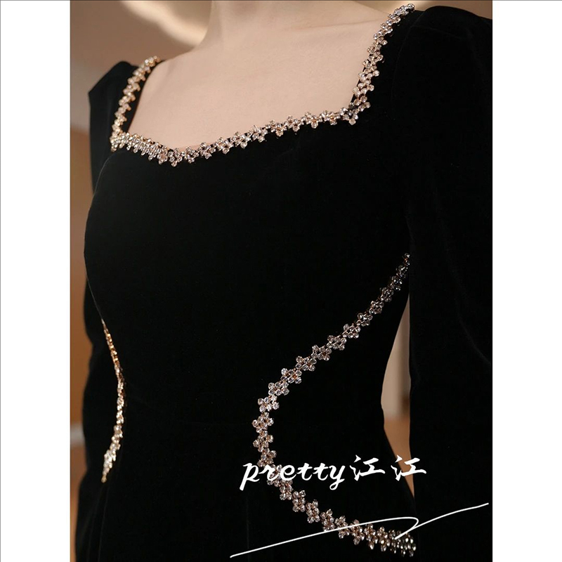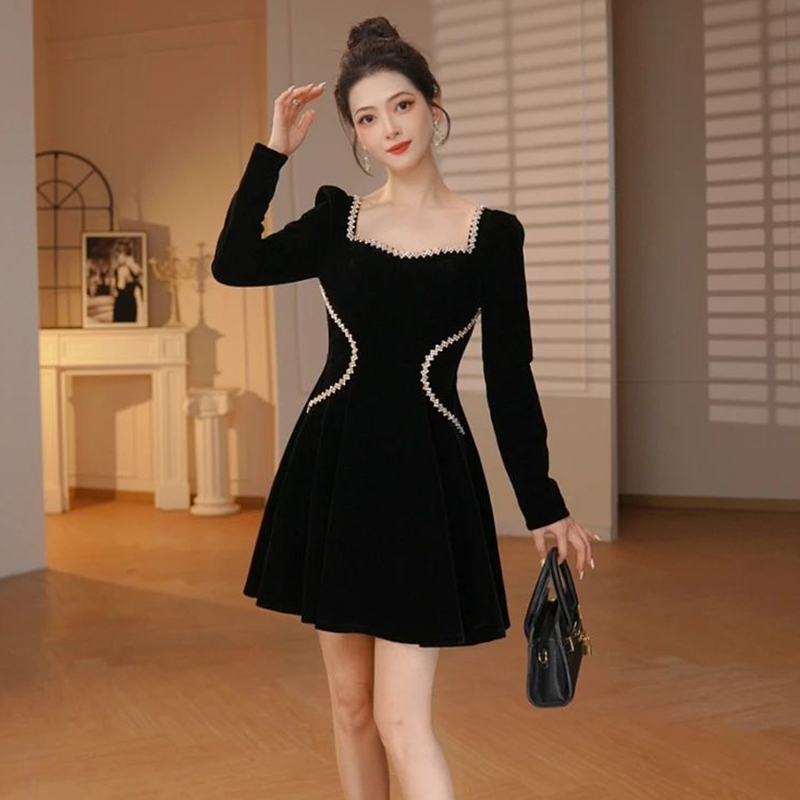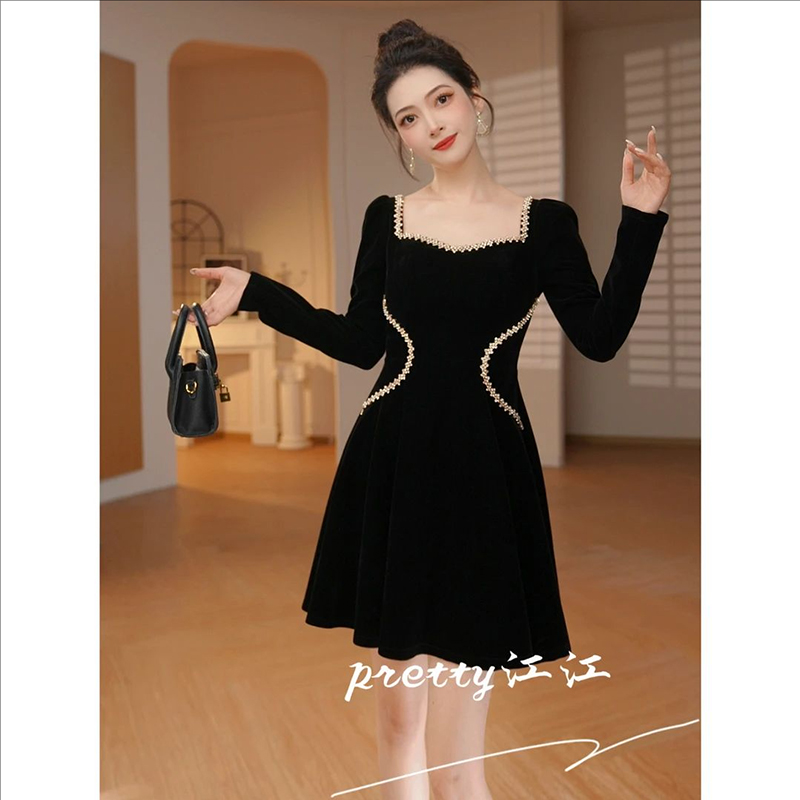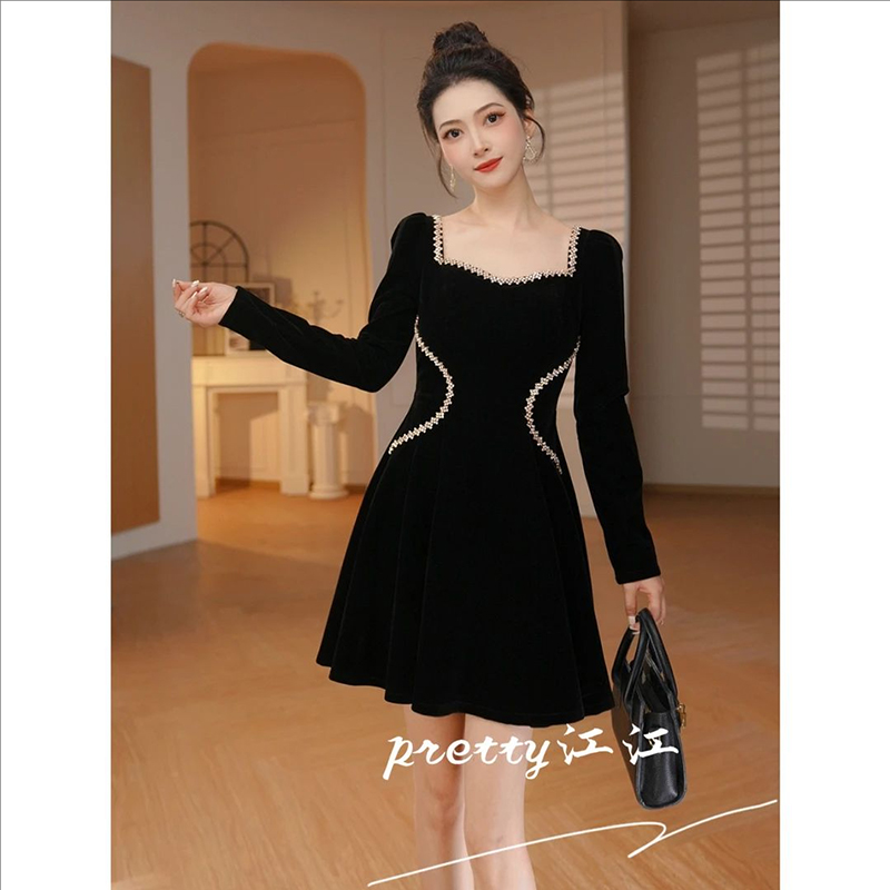 重要场合千金风黑色丝绒连衣裙秋冬优雅复古高级感方领短裙小黑裙