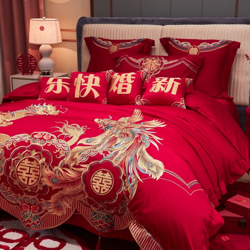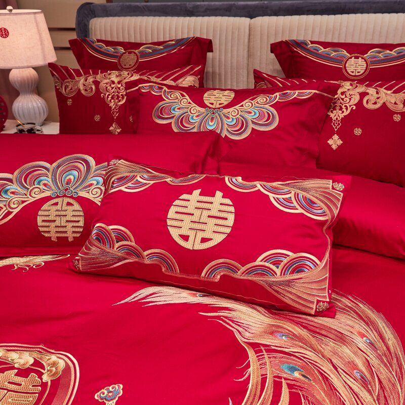 新中式全棉刺绣婚庆四件套40S红色纯棉被套床单结婚喜庆