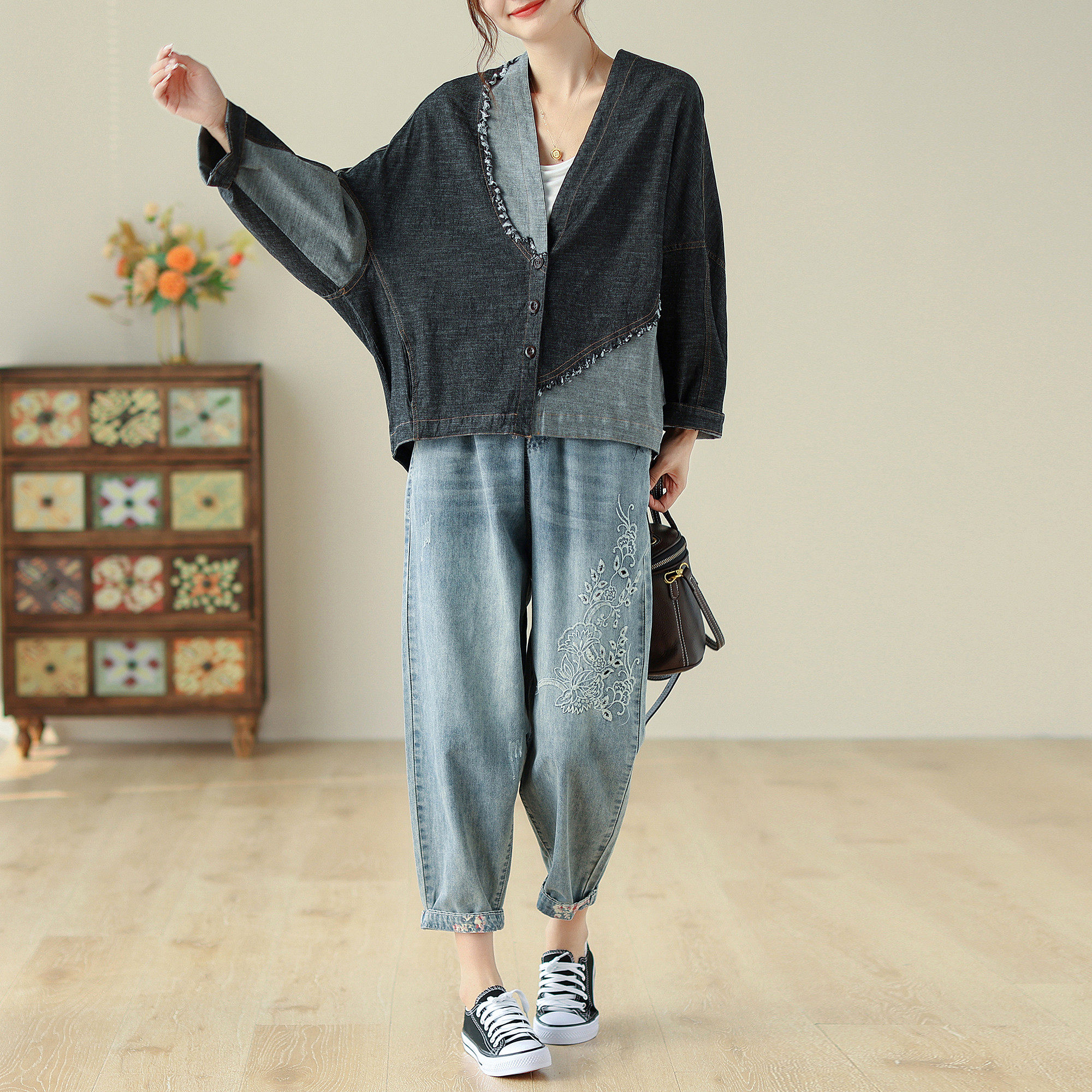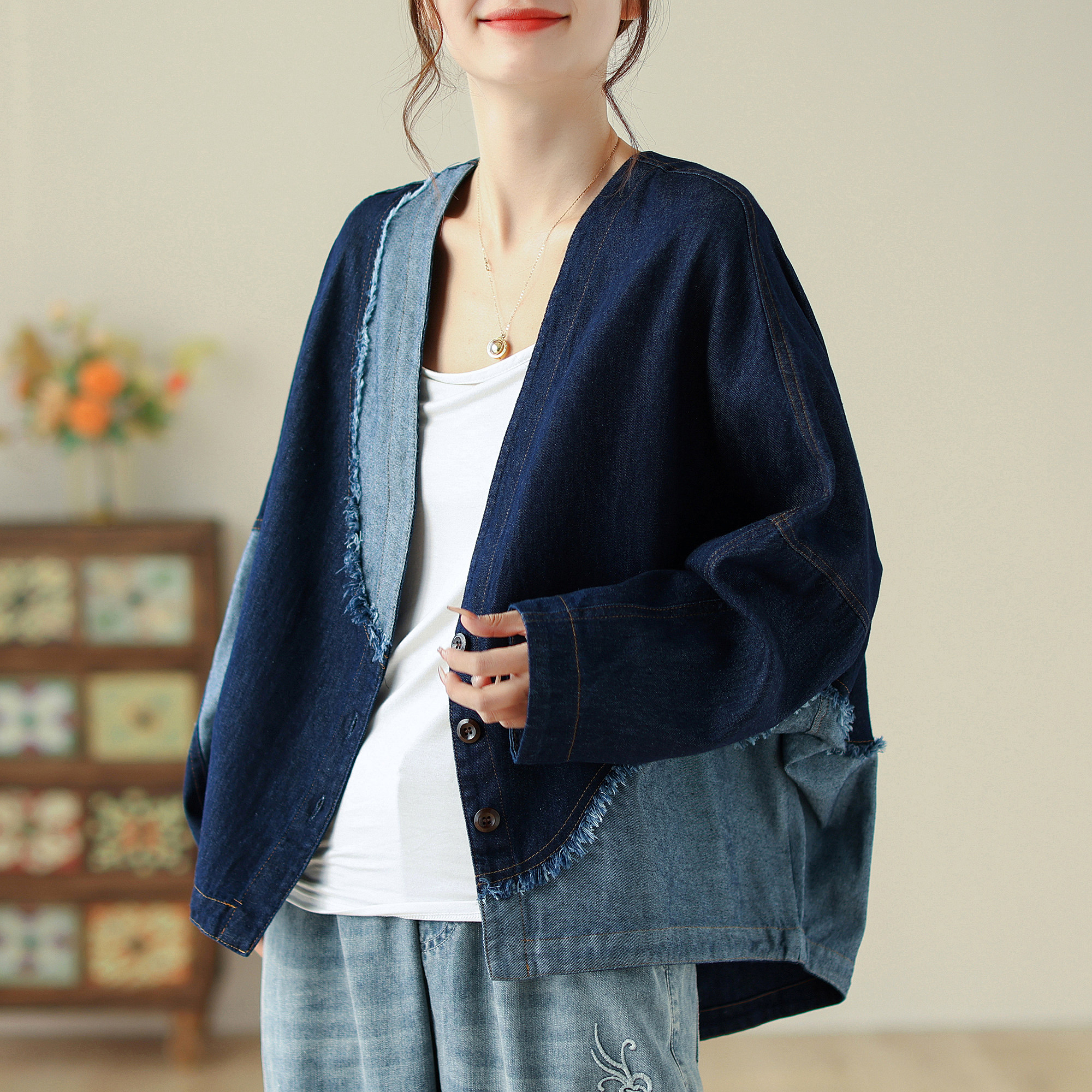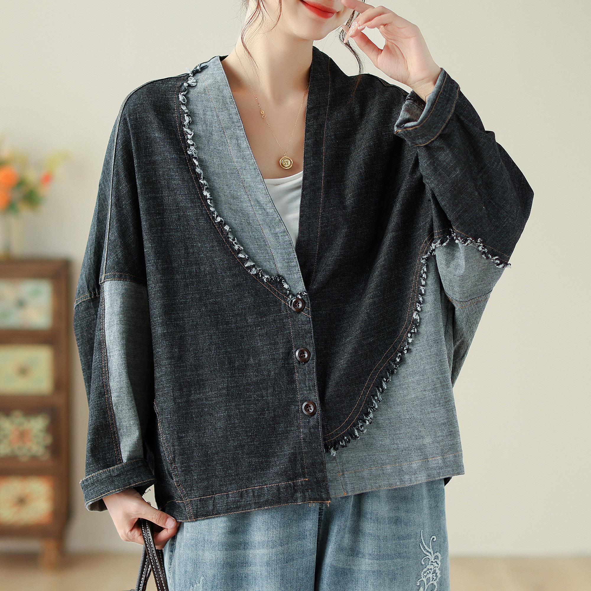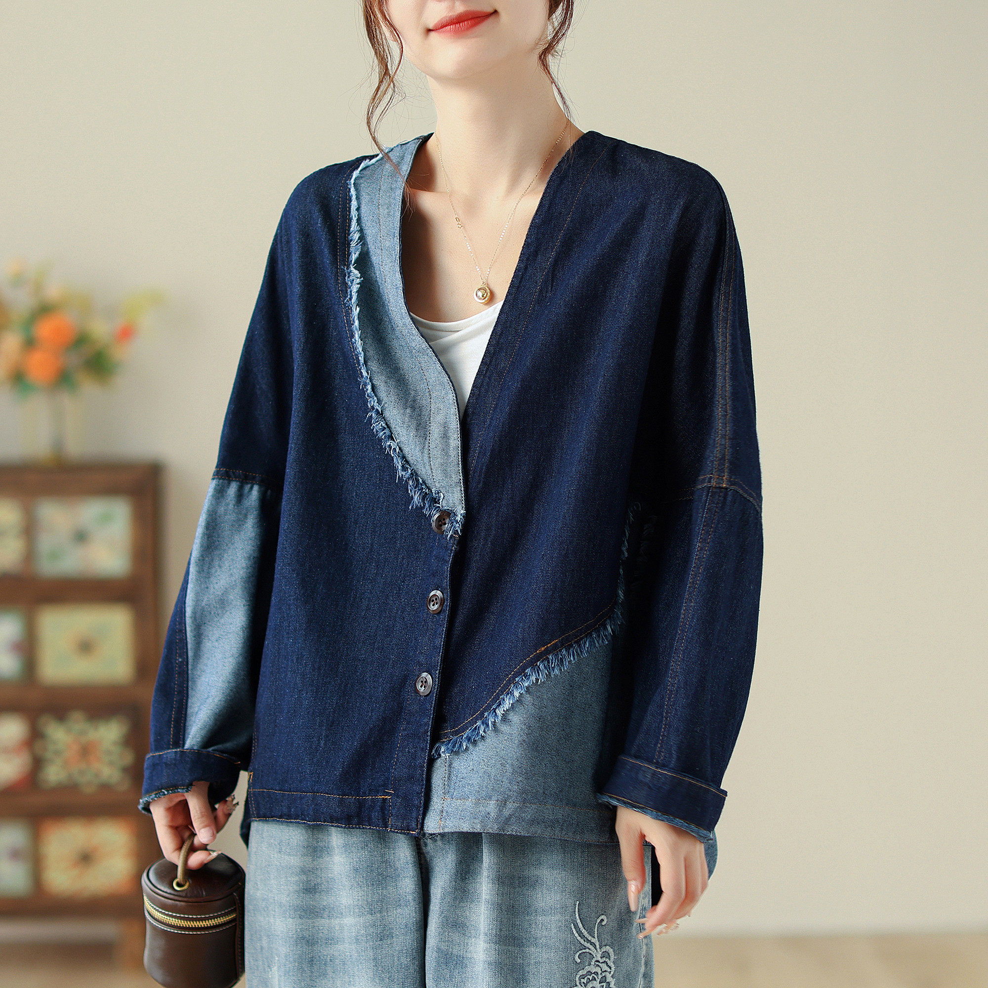 设计感小众独特别致牛仔拼接开衫短款外套女春秋宽松V领夹克上衣