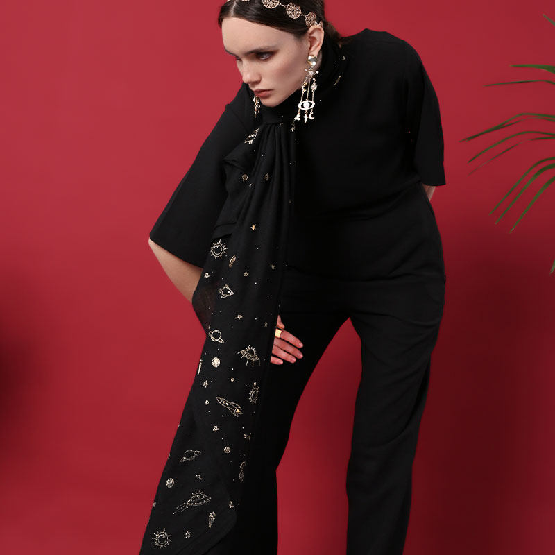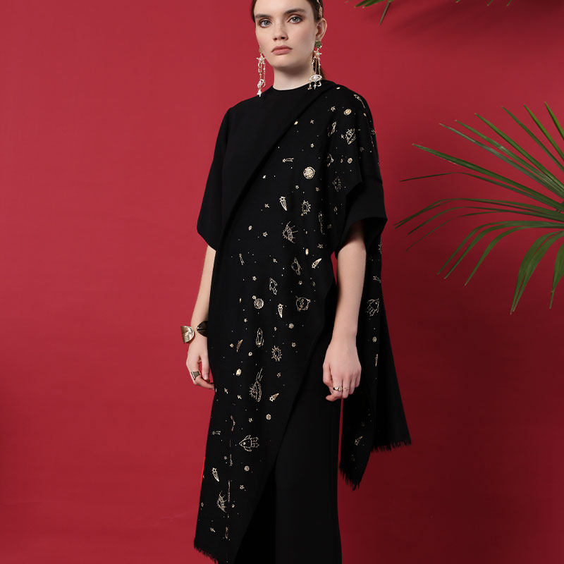 璀璨星空礼品 加密pashmina羊绒围巾 金线刺绣手工烫钻黑色披肩女