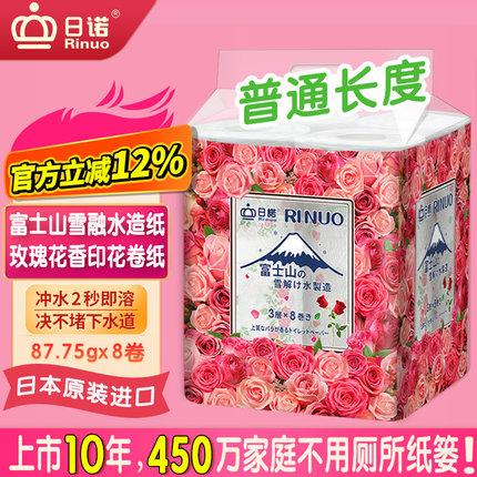 日诺日本进口玫瑰花香卷筒纸印花卫生纸可溶水溶厕纸有芯卷纸8卷