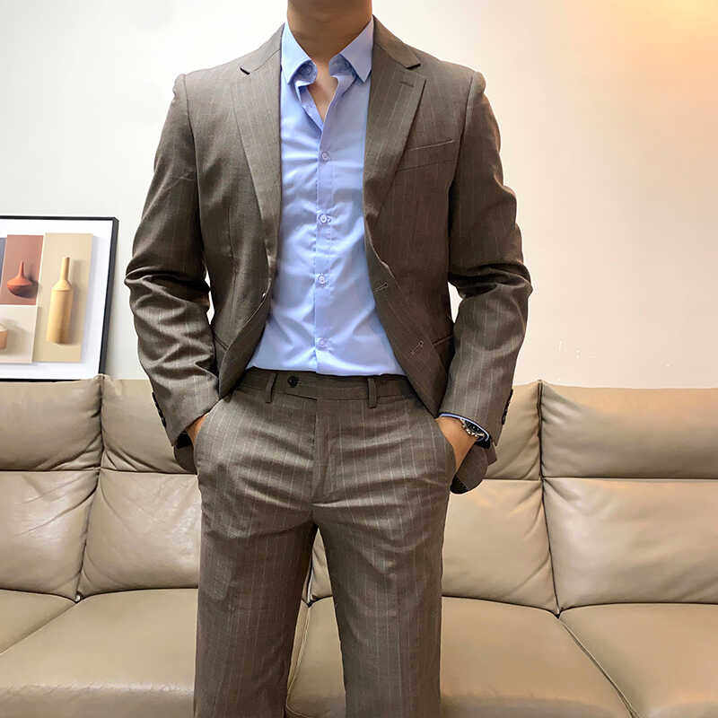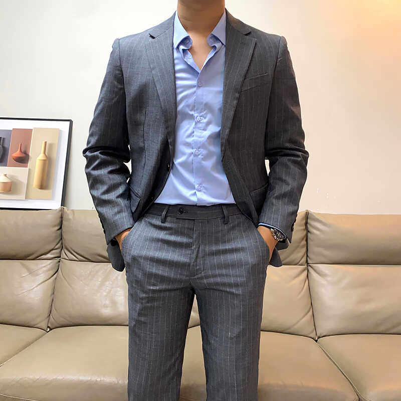 秋季新款男士商务正装条纹西服套装修身韩版青年休闲西装两件套潮