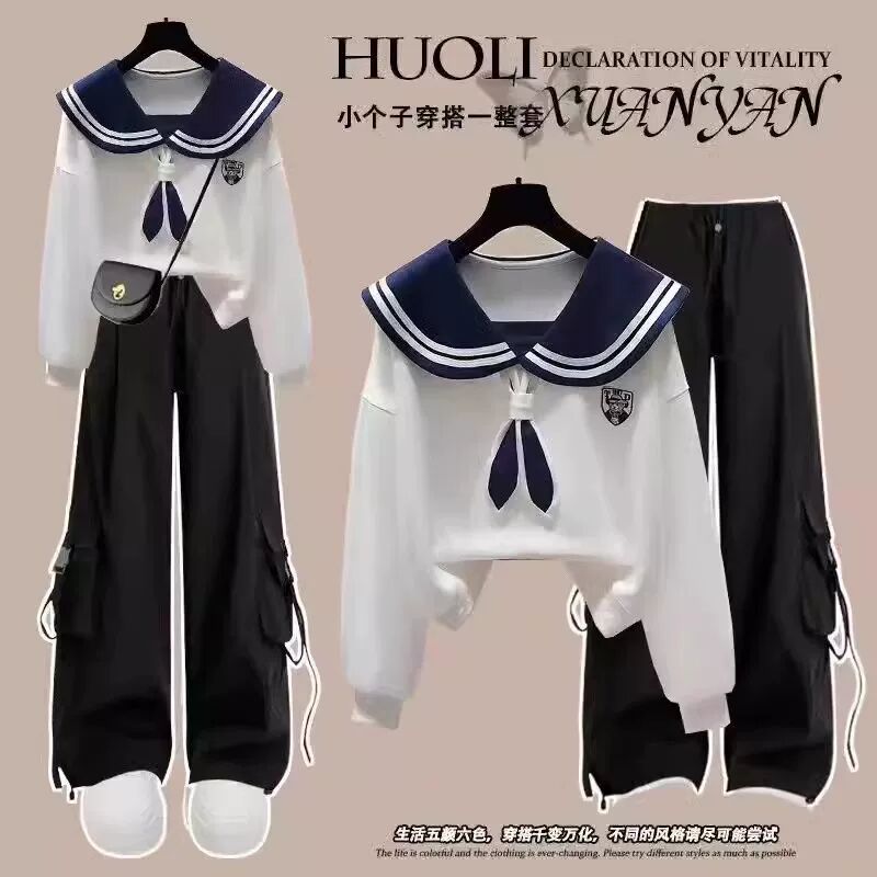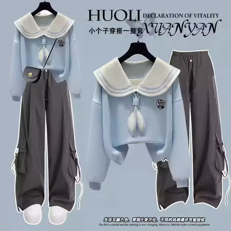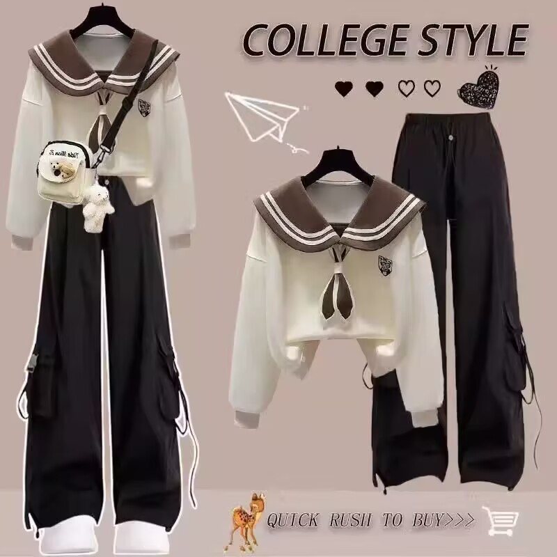 女童秋季套装2025新款娃娃领长袖学院风卫衣青少年工装裤子两件套