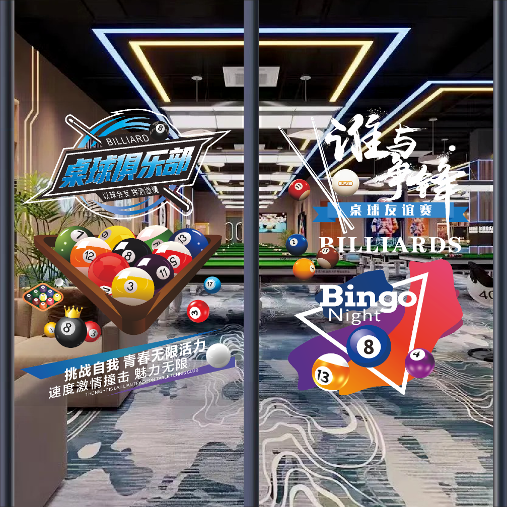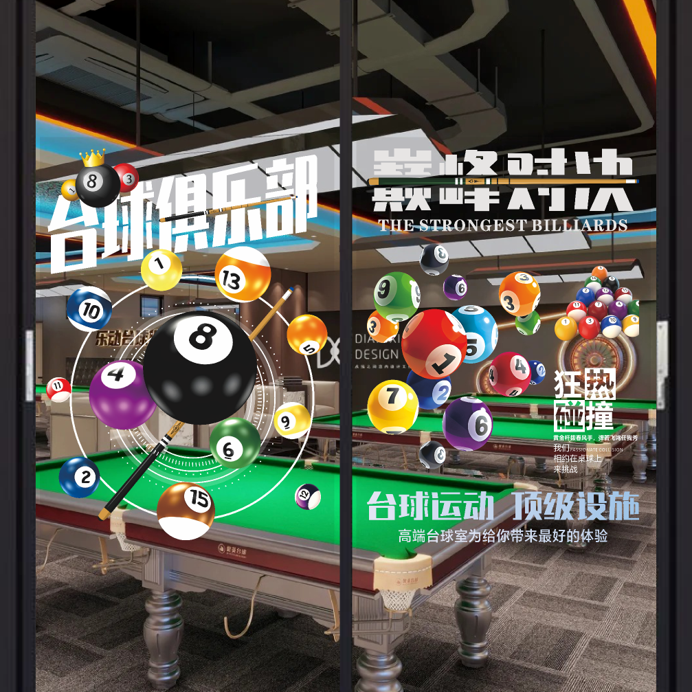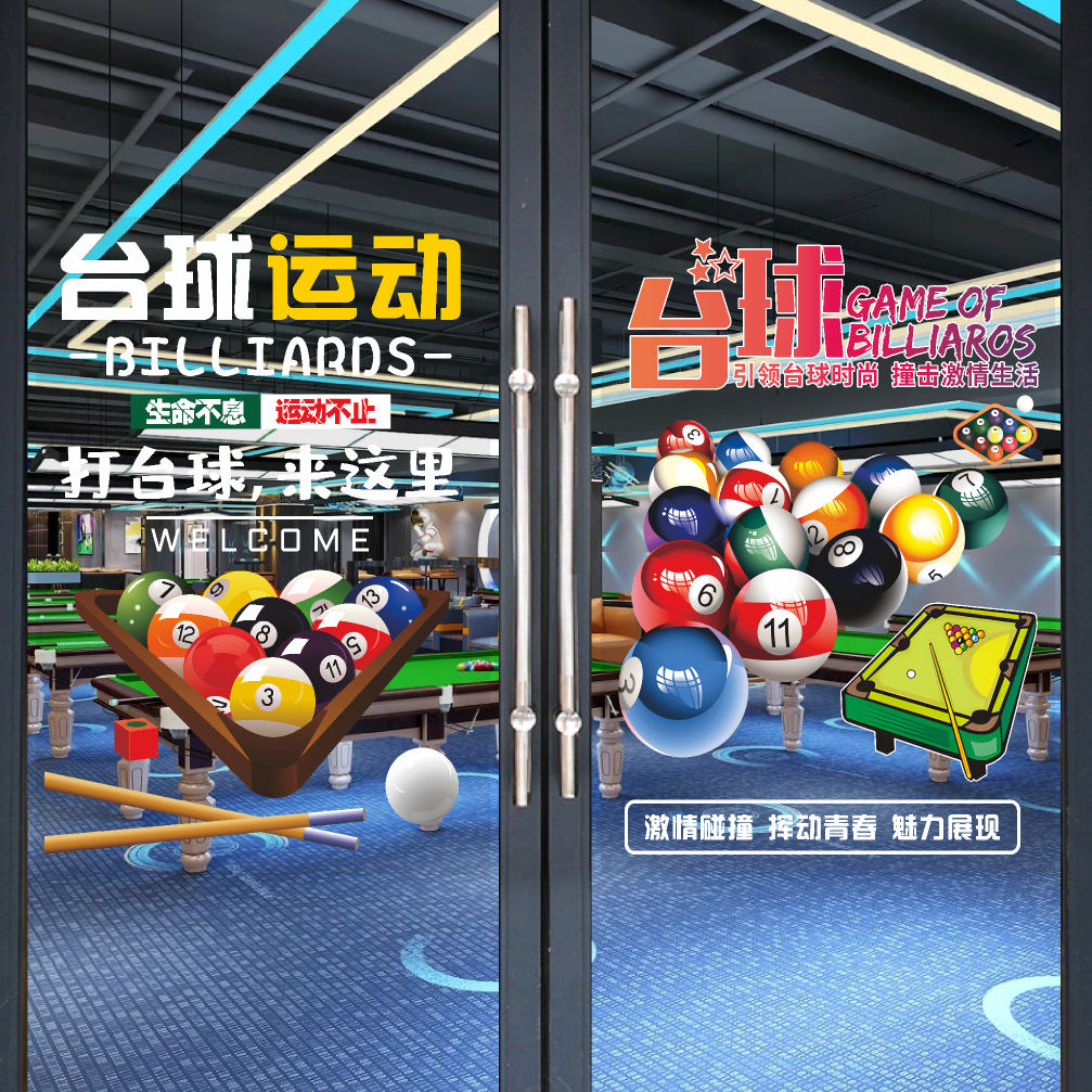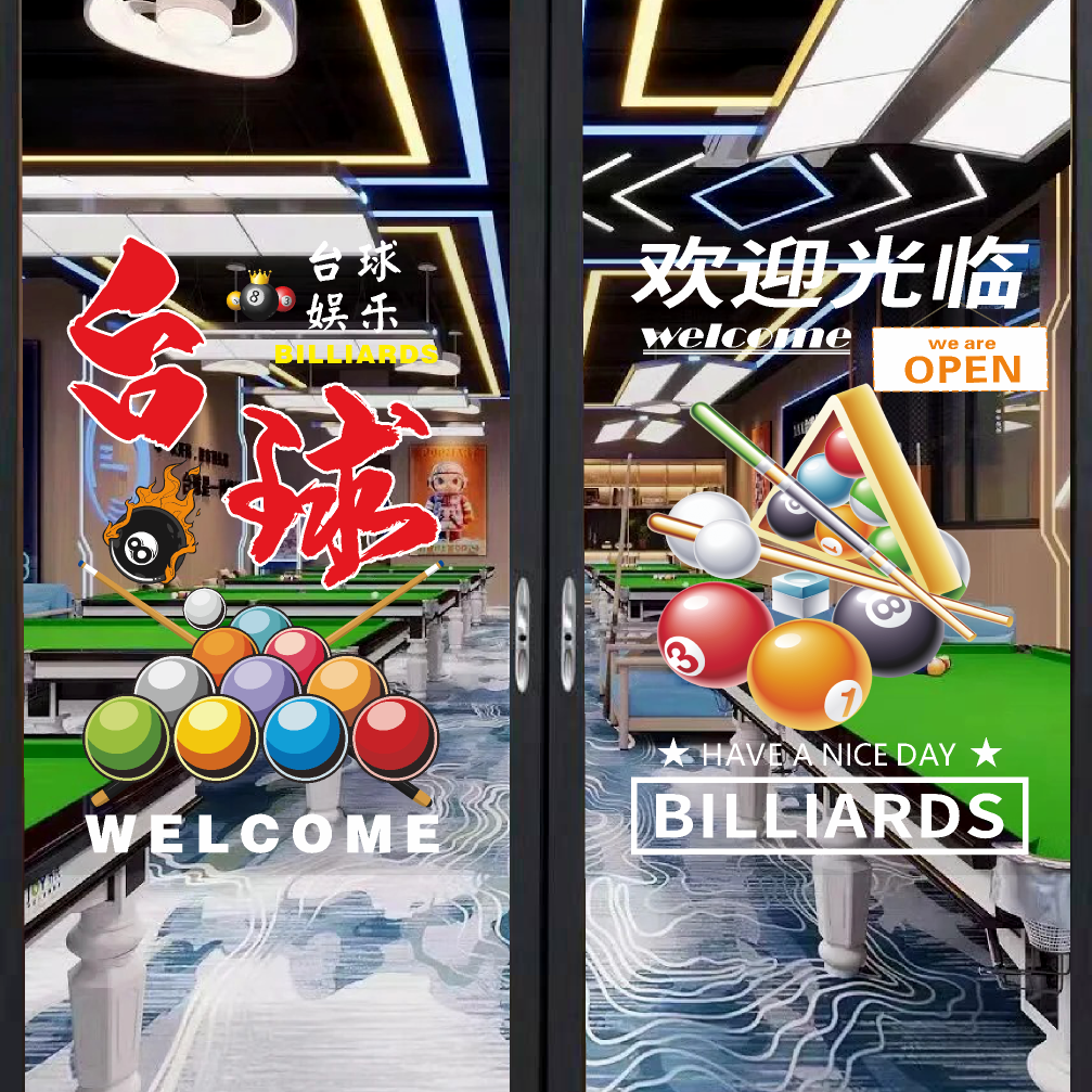 创意桌球室玻璃广告贴纸台球厅斯诺克美女俱乐部橱窗欢迎光临墙贴