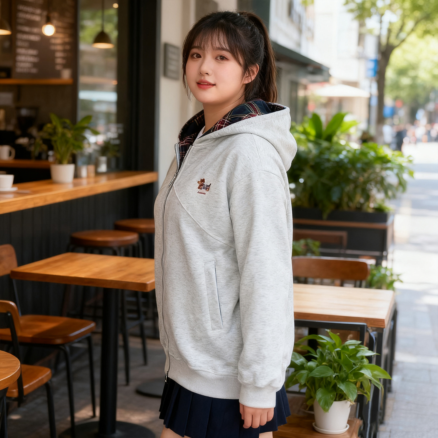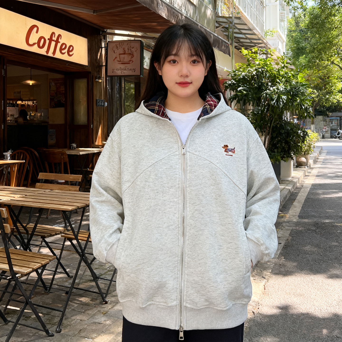 2025秋冬季大码胖mm腊肠狗刺绣格子拼接连帽外套女宽松慵懒风卫衣