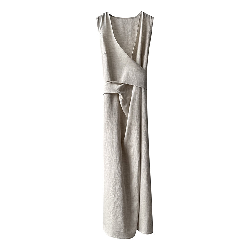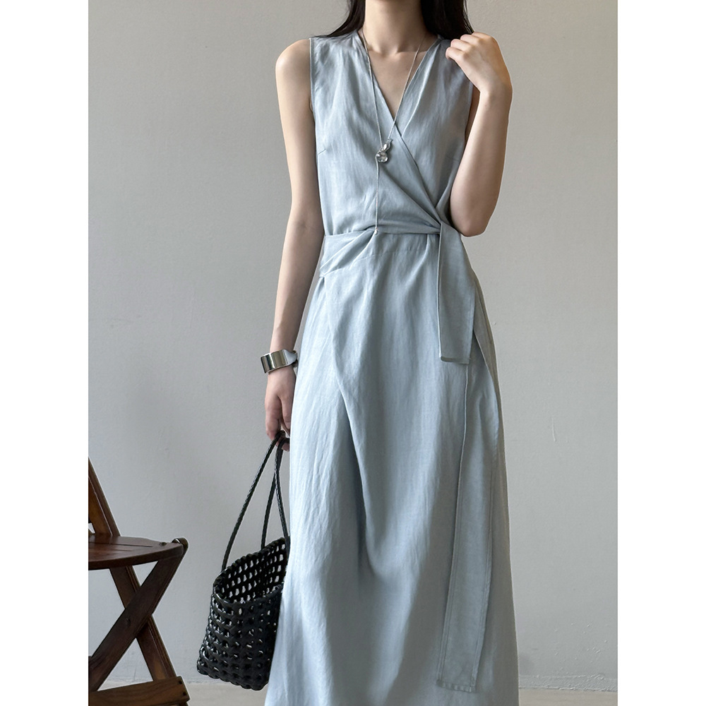 言双 法式天丝亚麻无袖背心v领连衣裙夏季韩版时尚百搭裙子82313