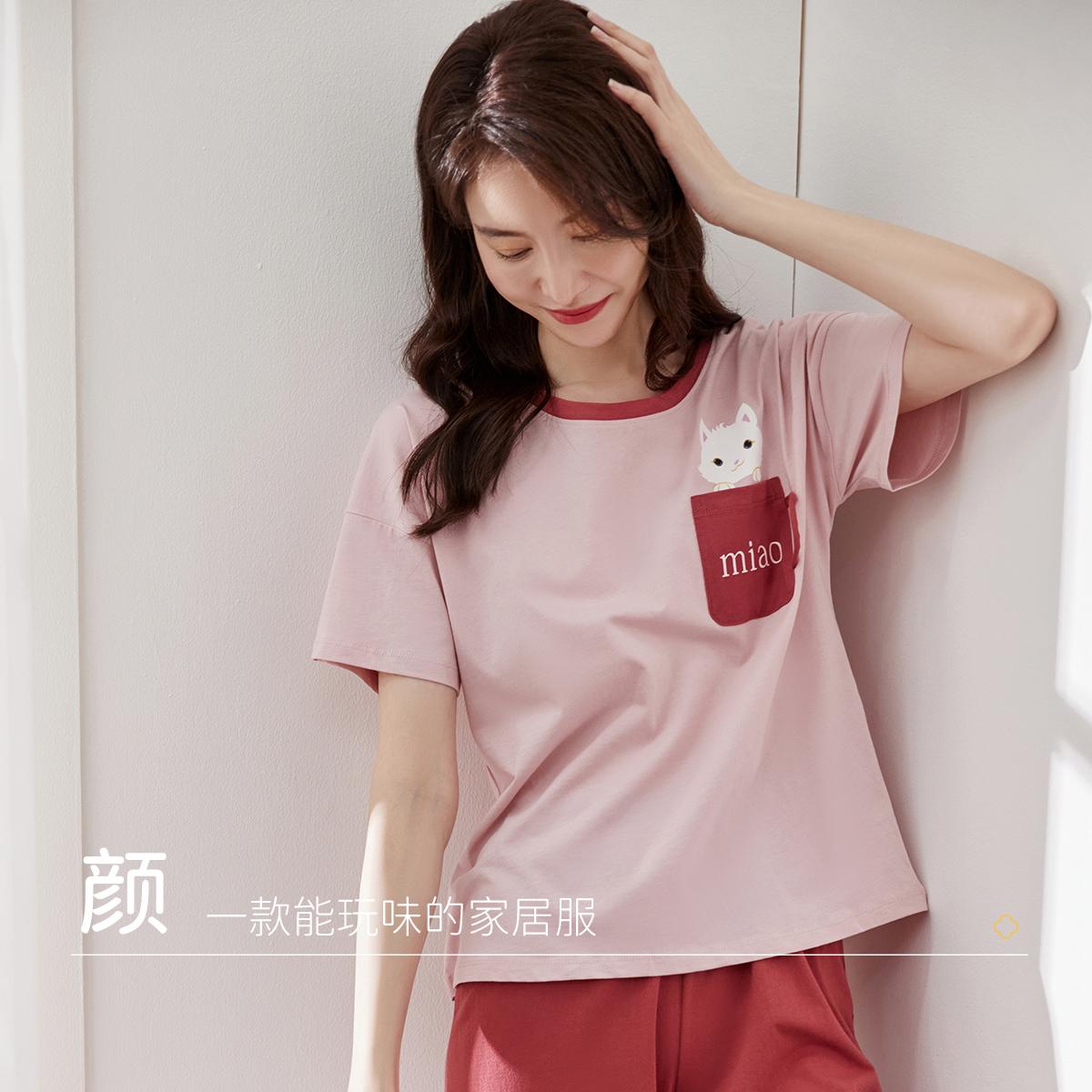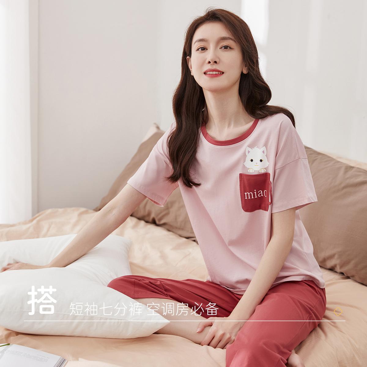 顶瓜瓜纯棉睡衣女款春夏季短袖七分裤薄款卡通猫咪家居服套装